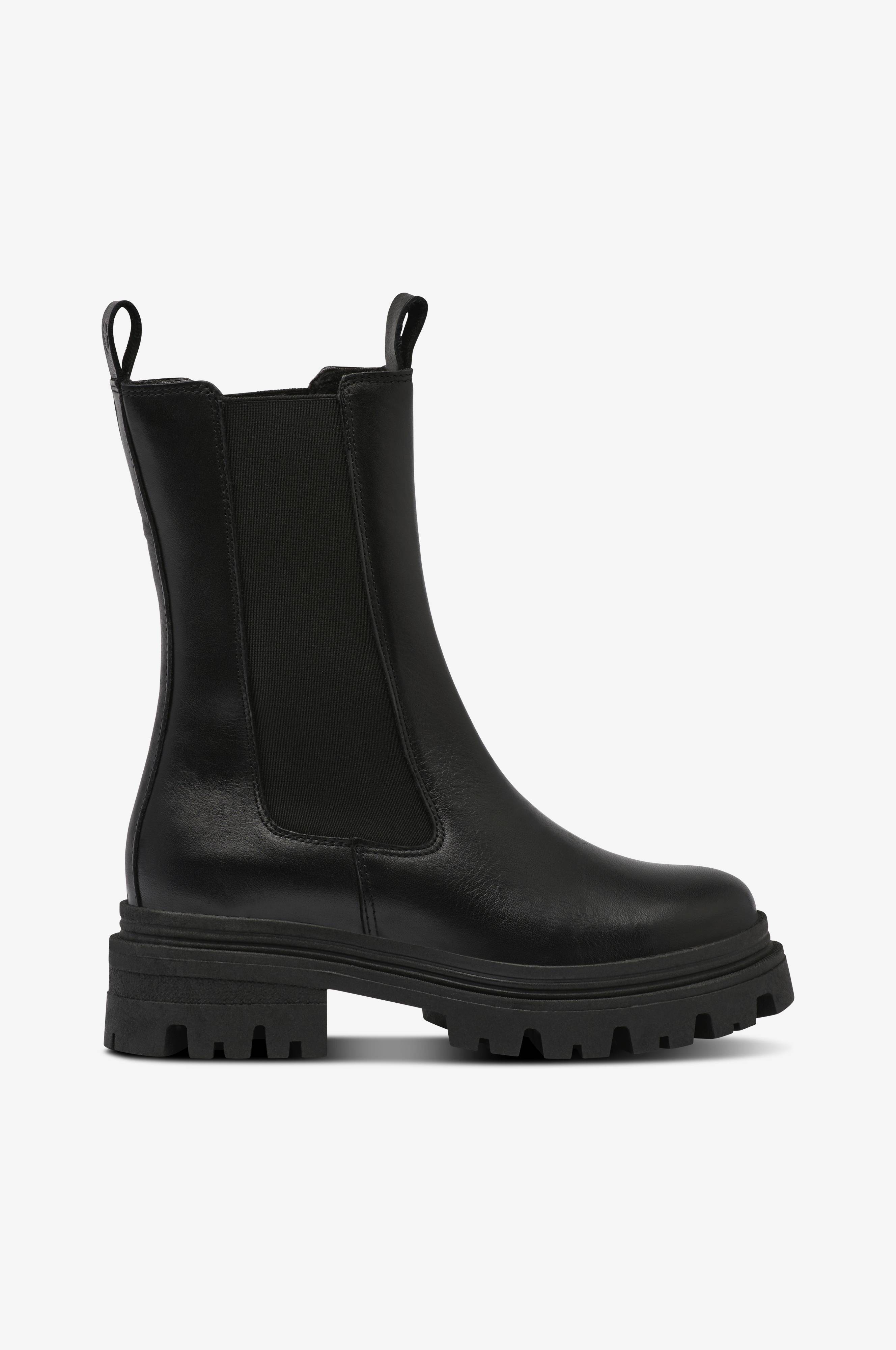 • Modell i skinn • Resårpaneler på skaftets båda sidor • Draghälla fram och bak • Mjukt fleecefoder • Greppsäker, grovmönstrad sula • Skafthöjd: 20,5 cm i stl 37 • Klackhöjd: 5,5 cm