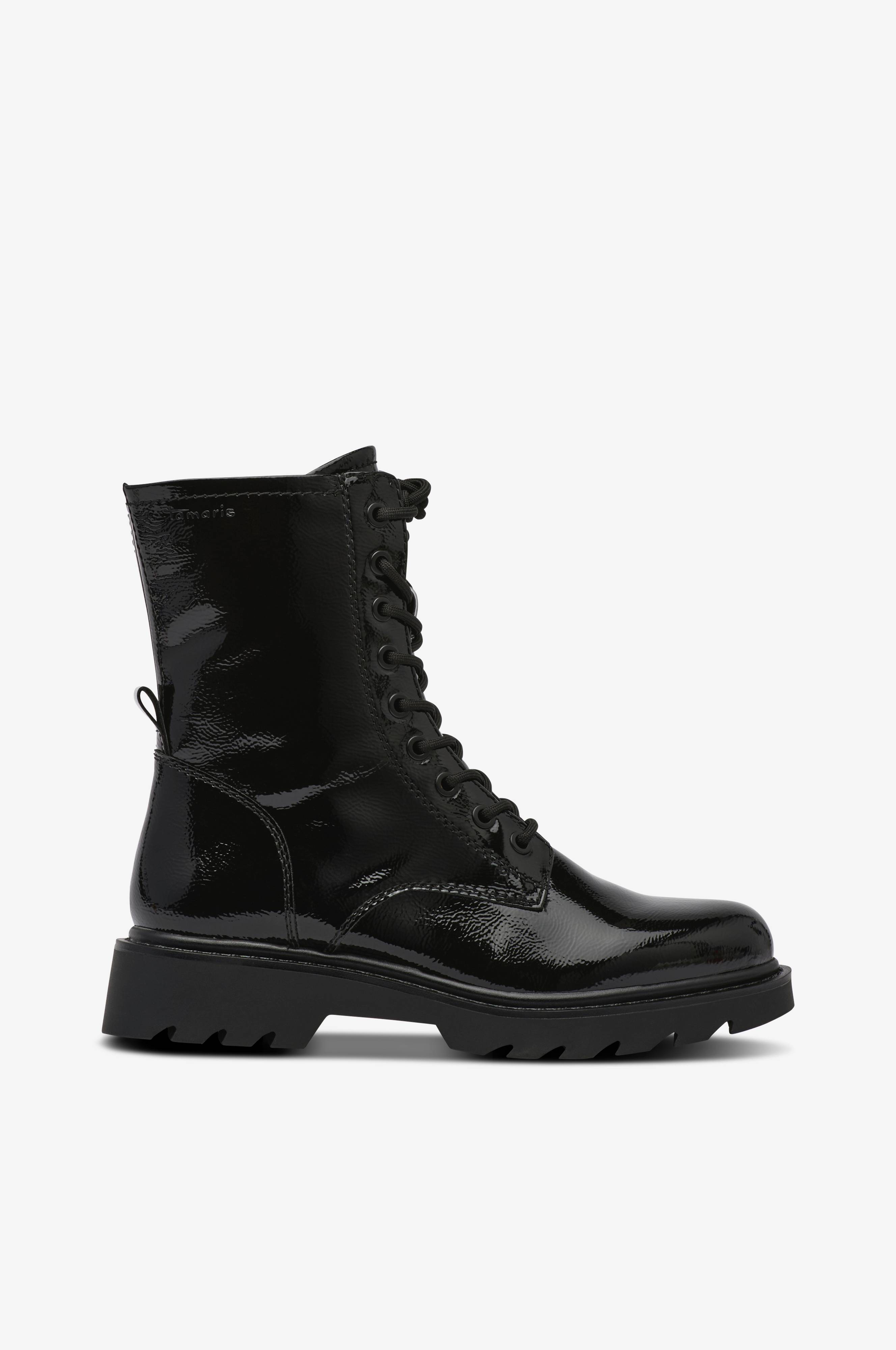 • Blank modell i skinnimitation • Snörning • Dragkedja på insidan av skaftet • Varmfodrade • Draghälla bak • Greppsäker, grovmönstrad sula • Klackhöjd: 3,5 cm