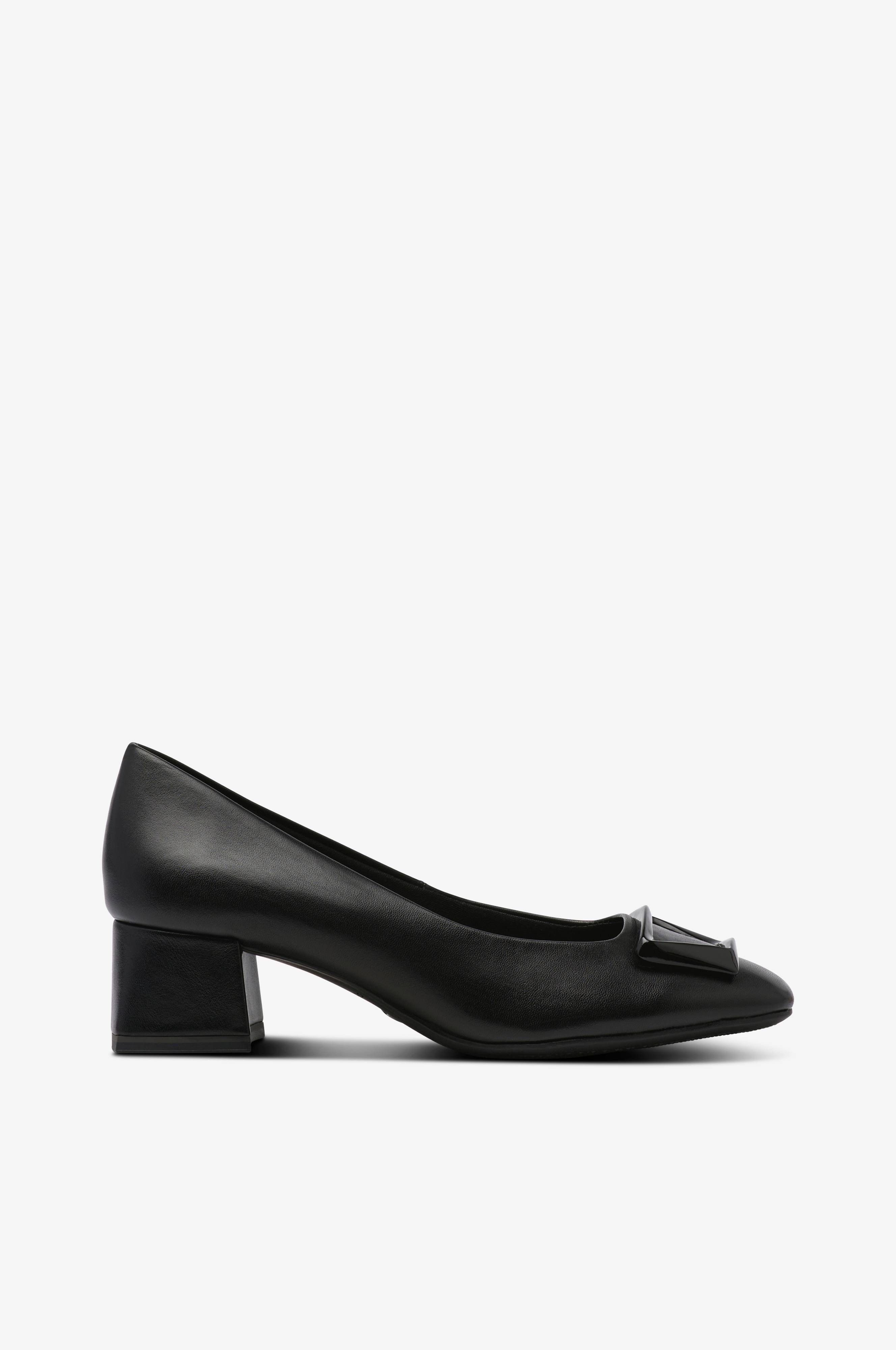 Pumps i skinn med skinnklädd blockklack. Dekorativ detalj i svart, högblank metall framtill. Textilfoder och mjukstoppad, skinnklädd fotbädd. Klackhöjd 4 cm.