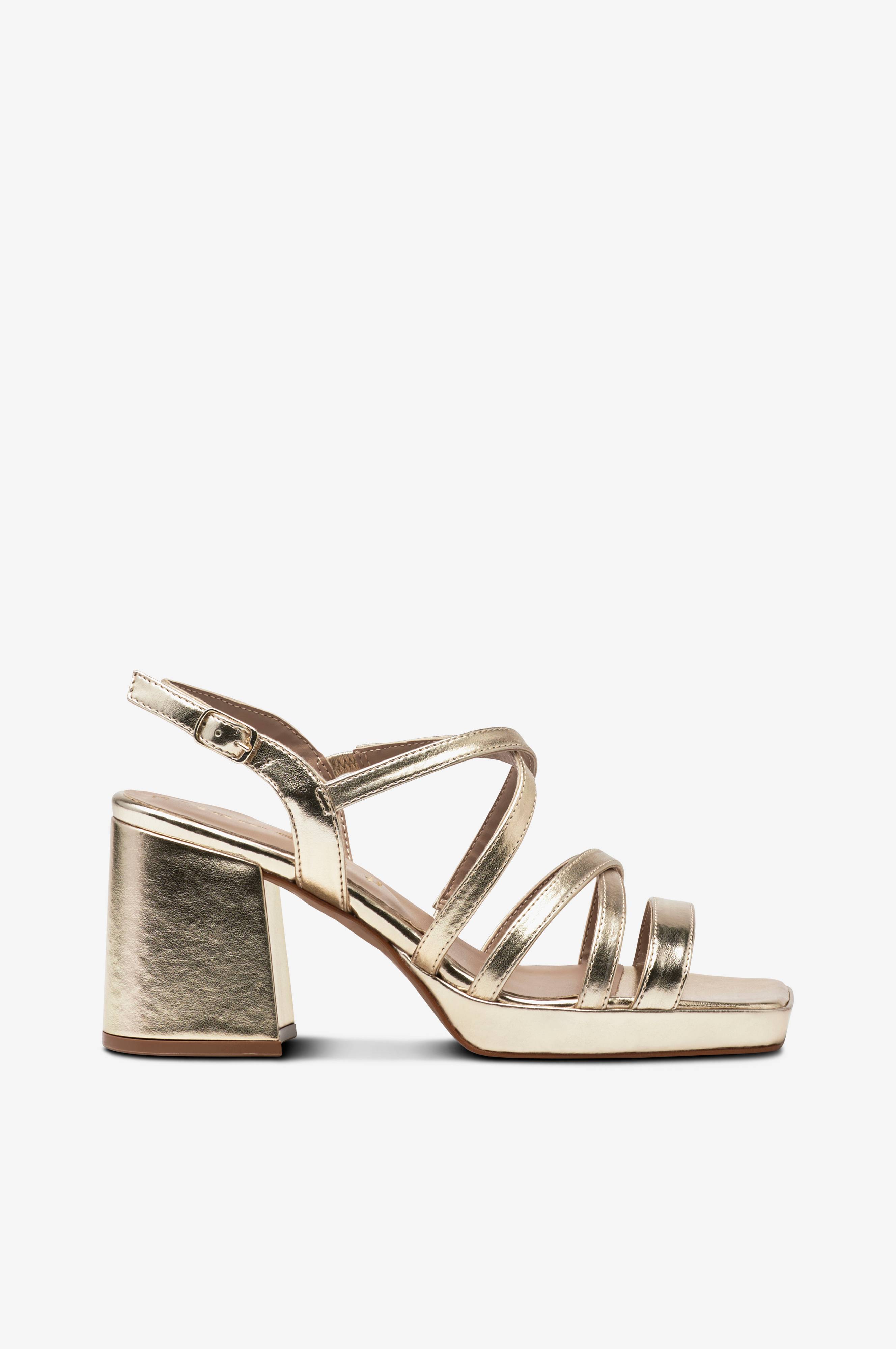 • Guldfärgade sandaletter• Smala remmar i skinnimitation• Hög blockklack• Fyrkantig tå• Klackhöjd: 8 cm
