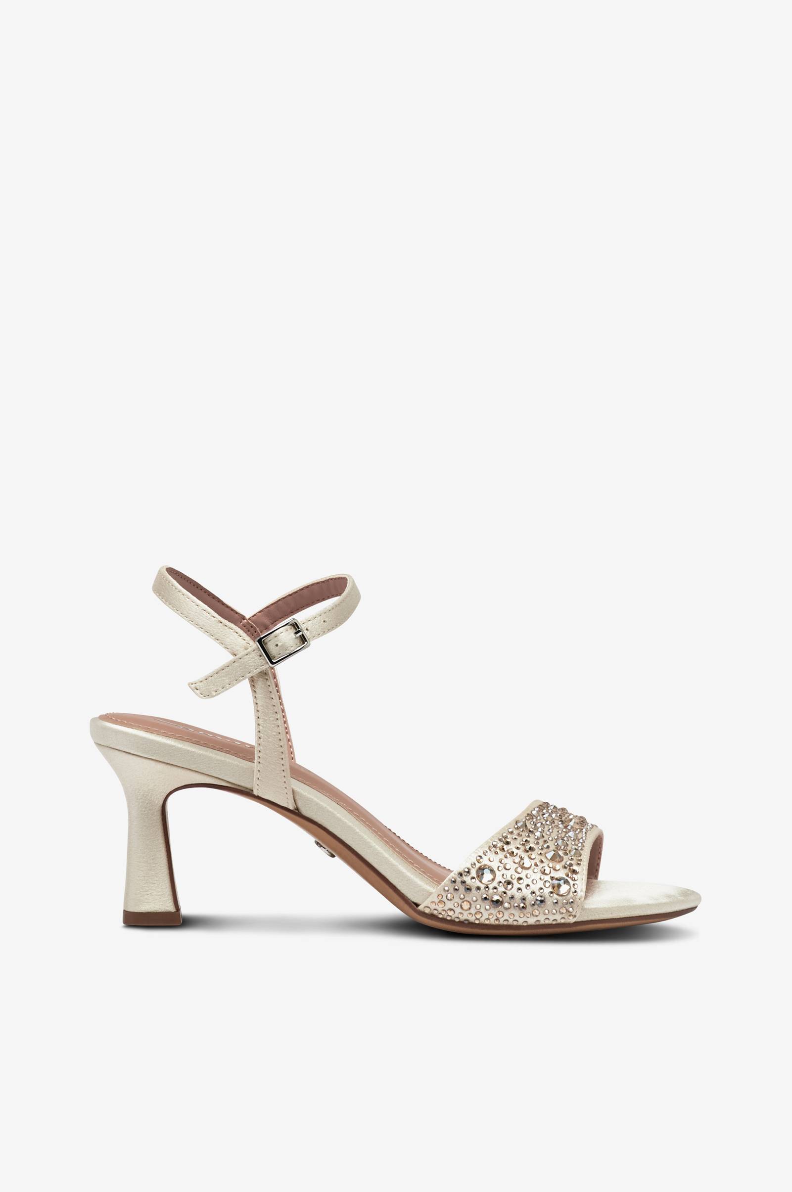 • Skimrande modell i satin med strasstenar fram• Smal, justerbar vristrem med elastisk infästning• Rundad tå• Mjukstoppad innersula• Hög, klädd klack• Klackhöjd: 6,5 cm