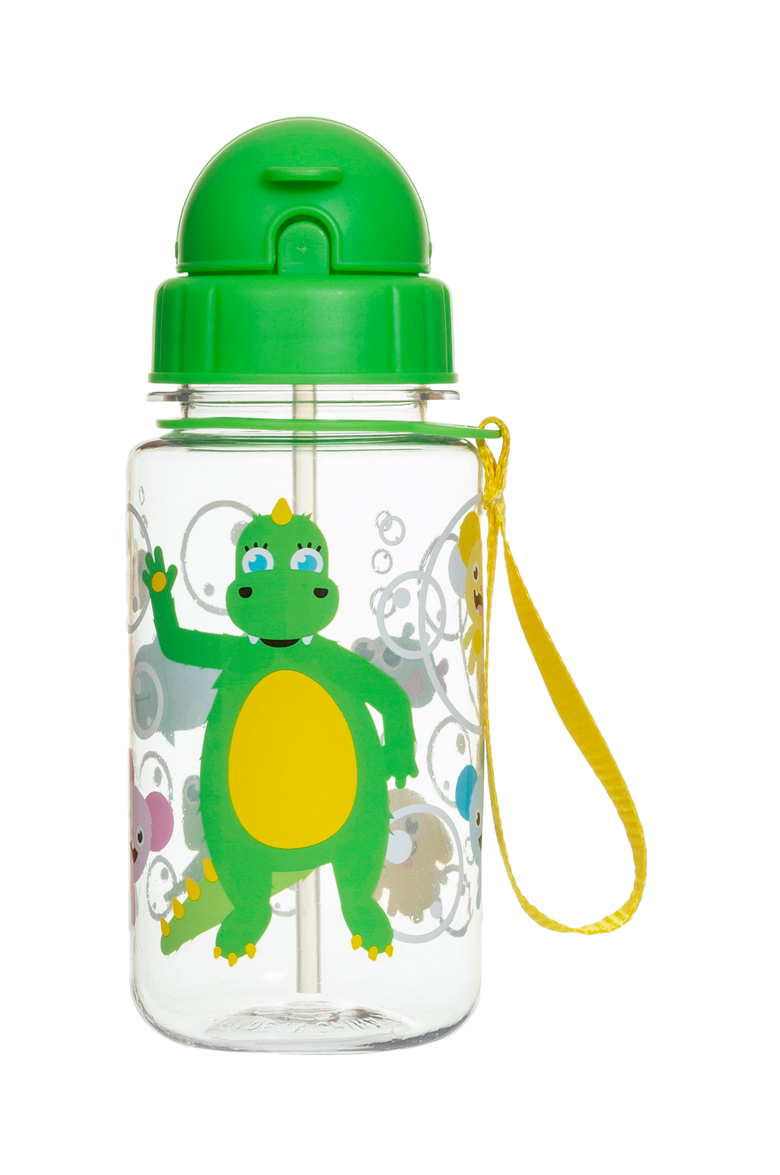 En smart design med ett barnvänligt lock som är lätt att både öppna och stänga. När du fäller ner locket följer sugröret med och blir inkapslat så att ingenting läcker. Runt flaskan sitter ett band som gör det lätt för barnet att bära flaskan eller hänga den på ryggsäcken.