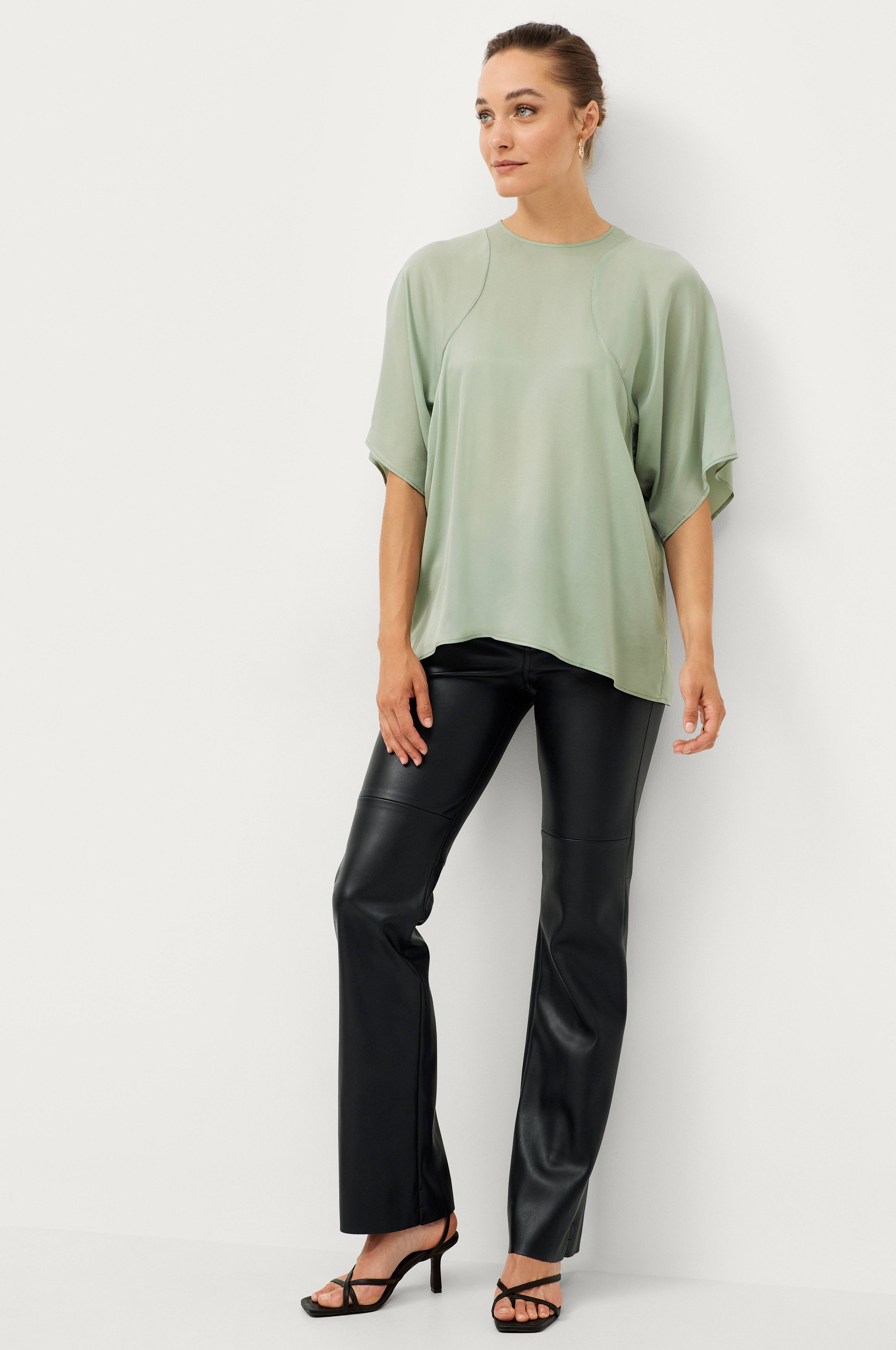 Blus i fin, sidenlik kvalitet med lyster. Halvlånga, vid kimonoärmar med rundad söm fram på axlarna. Djupt sprund med knapp i nacken. Lös passform.