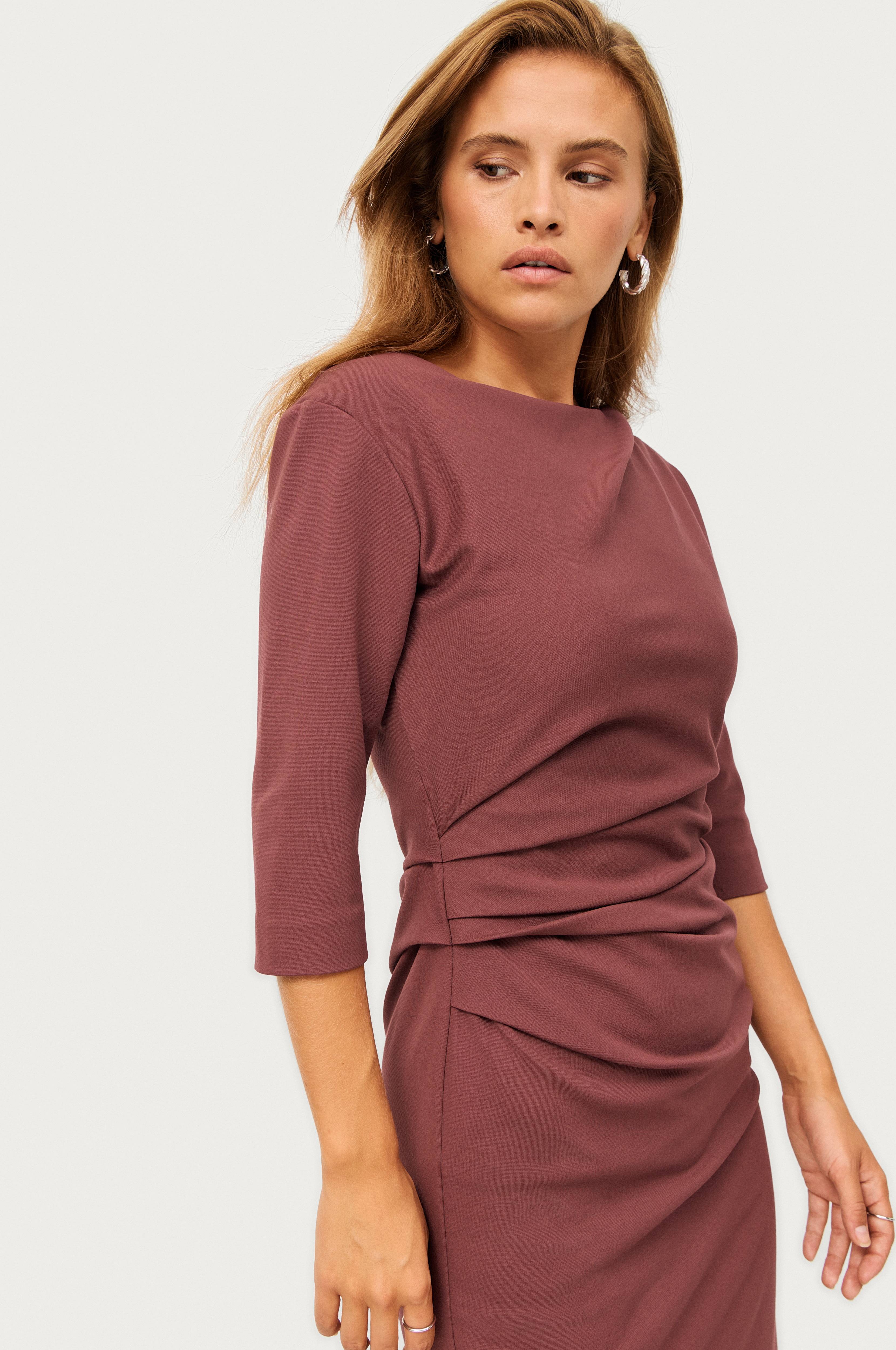 Klänning Izza S från Tiger of Sweden. Figurnära modell i jerseykvalitet med lagt veck på ena axel samt lagda draperingsveck fram i ena sidan. Rund halsringning med dold dragkedja i ryggen och rak, 3/4-lång ärm. Vävt foder. Längd ca 101 cm i stl 36.