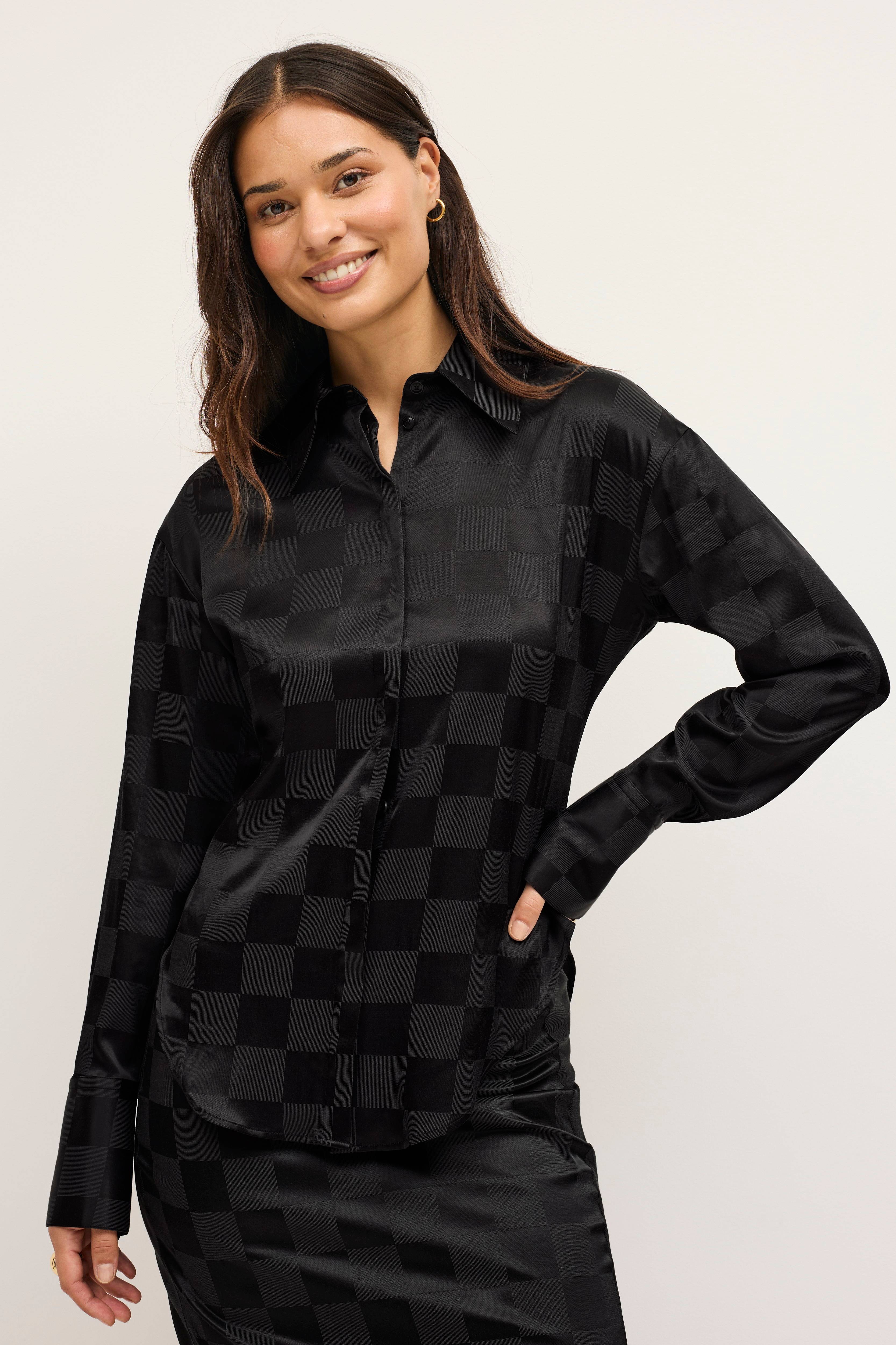 • Smal passform• Spetsig krage• Rundad nederkant• Överdimensionerade manschetter• Dolda knappar fram