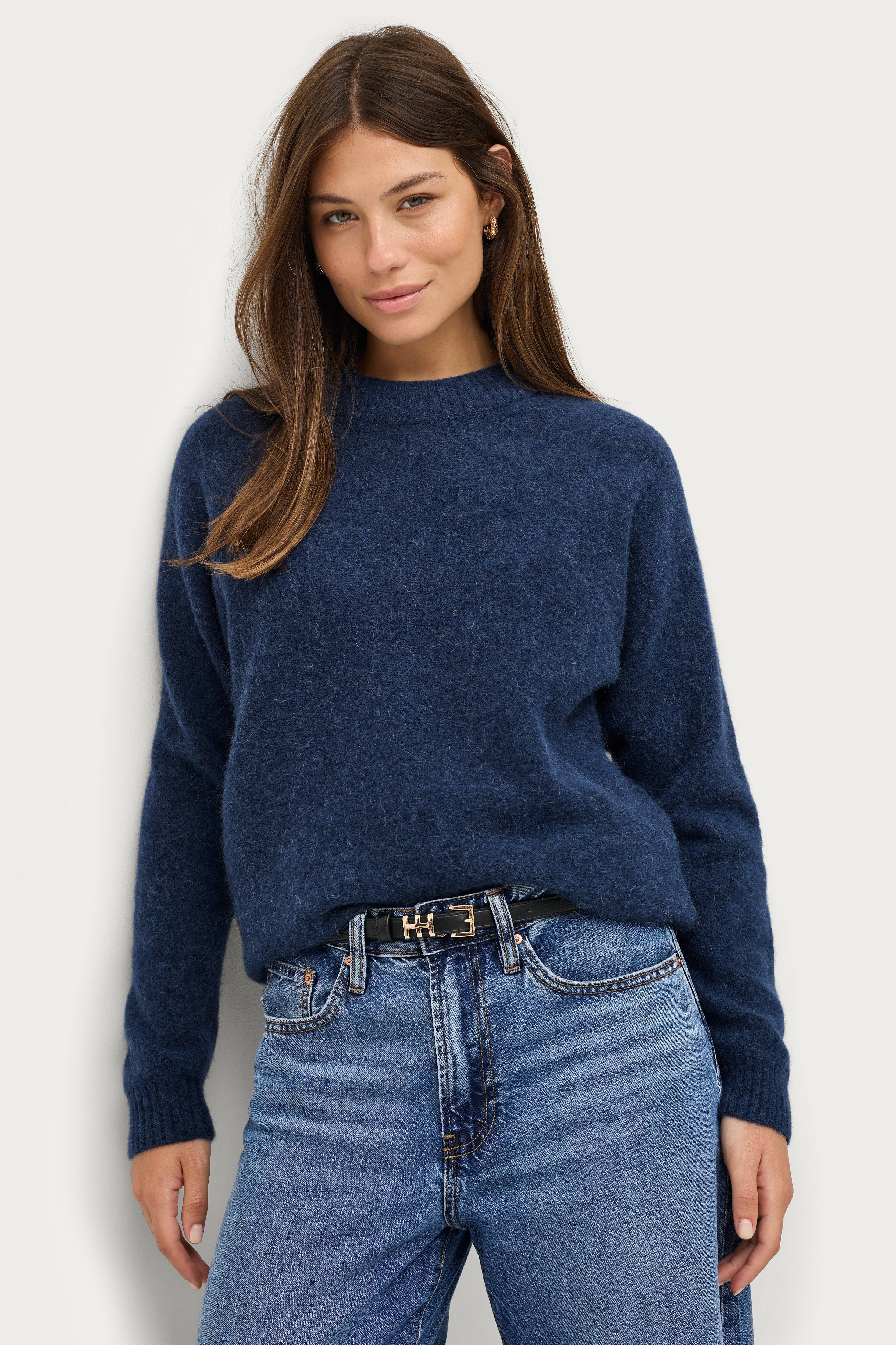 • Stickad tröja i ullmix• Klassisk modell• Hårig yta• Avslappnad passform• Fladdermusärm