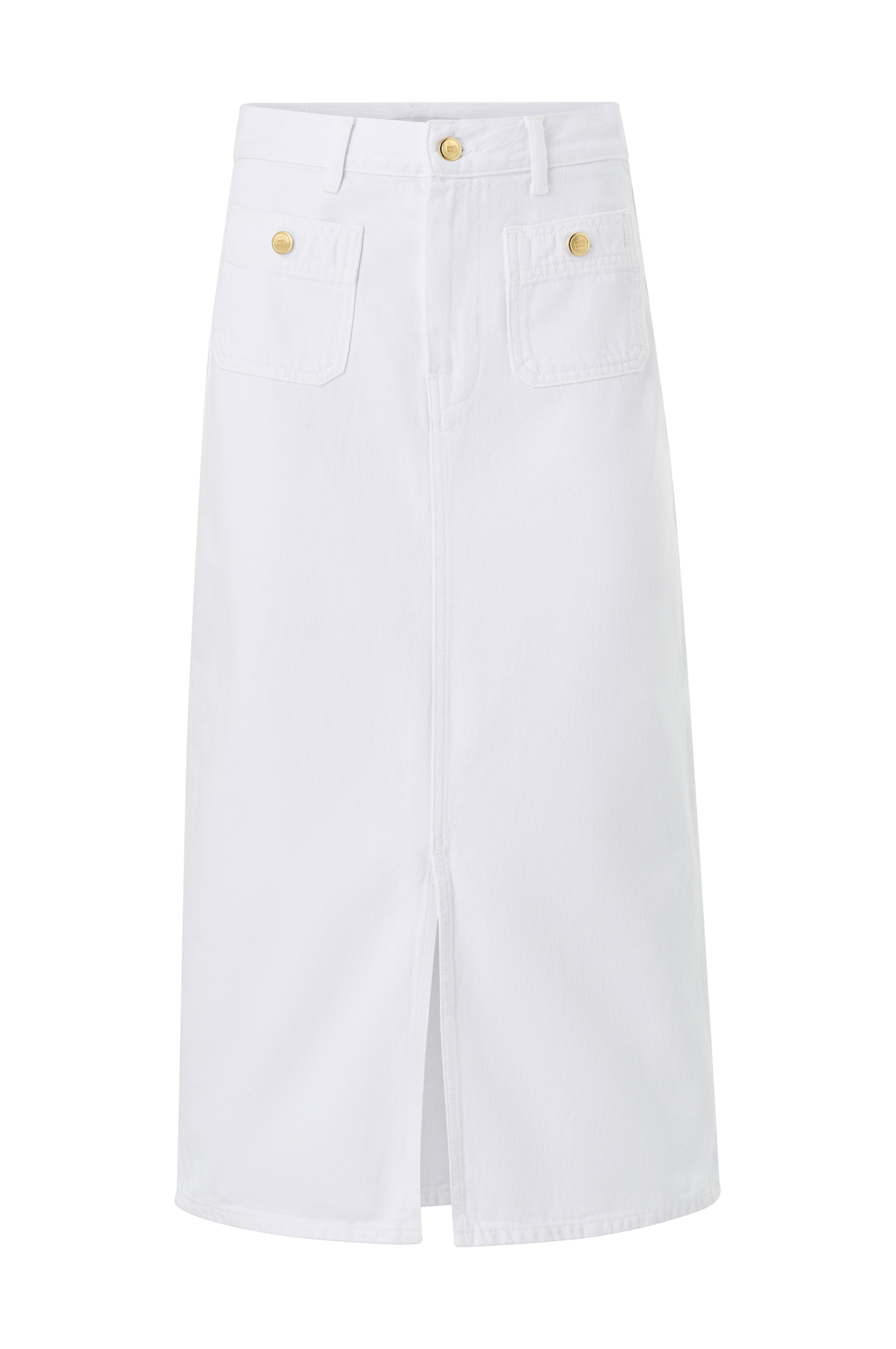 • Jeanskjol med hög midja• Bälteshällor• Dragkedjegylf• Två framfickor• Två bakfickor• Slits nedtill fram• Längd: 84 cm i storlek 36