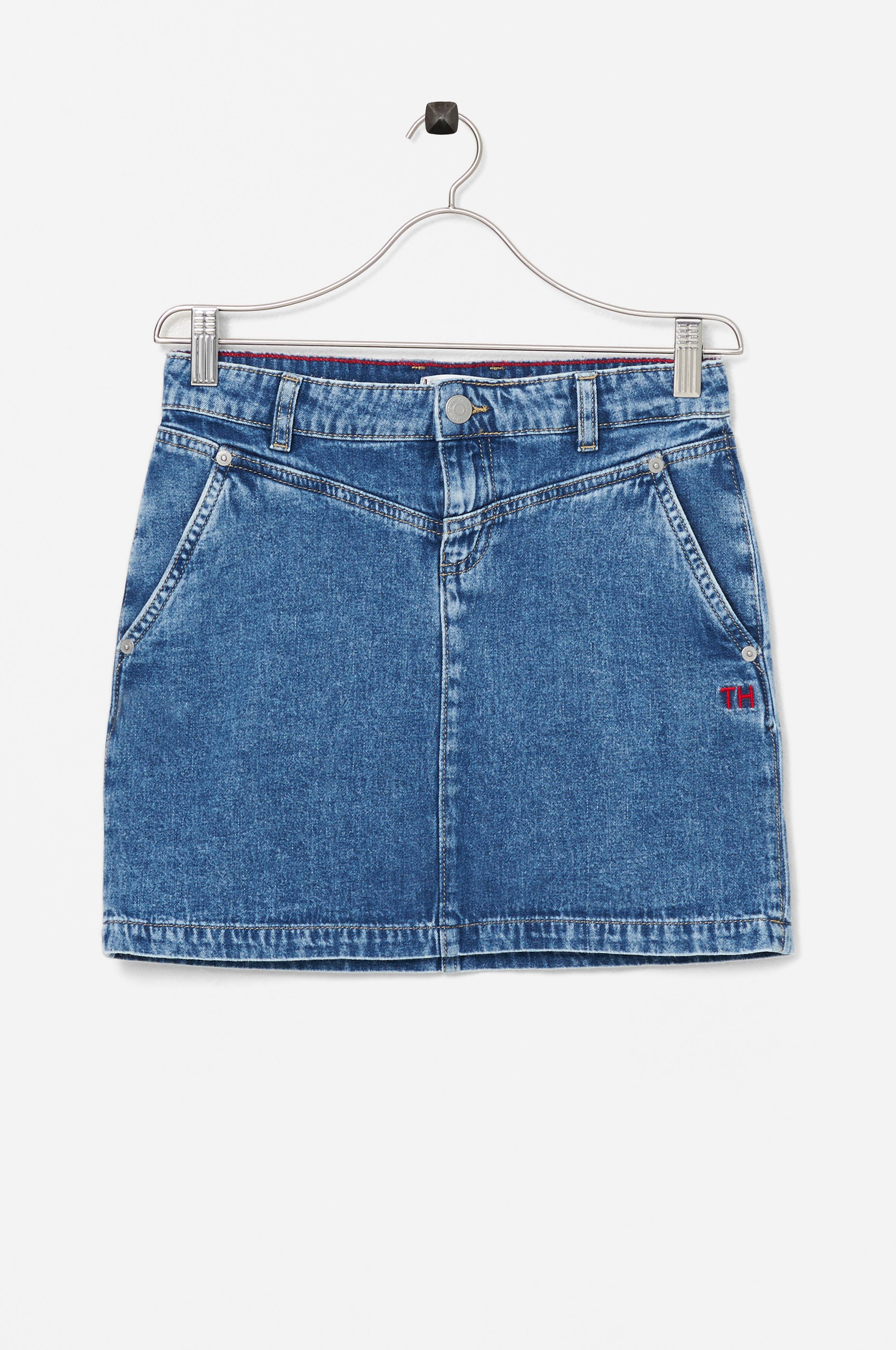 Jeanskjol i bomullsdenim. Reglerbar linning med hällor och knapp. Gylf med dragkedja. Två fickor fram och två bakfickor.