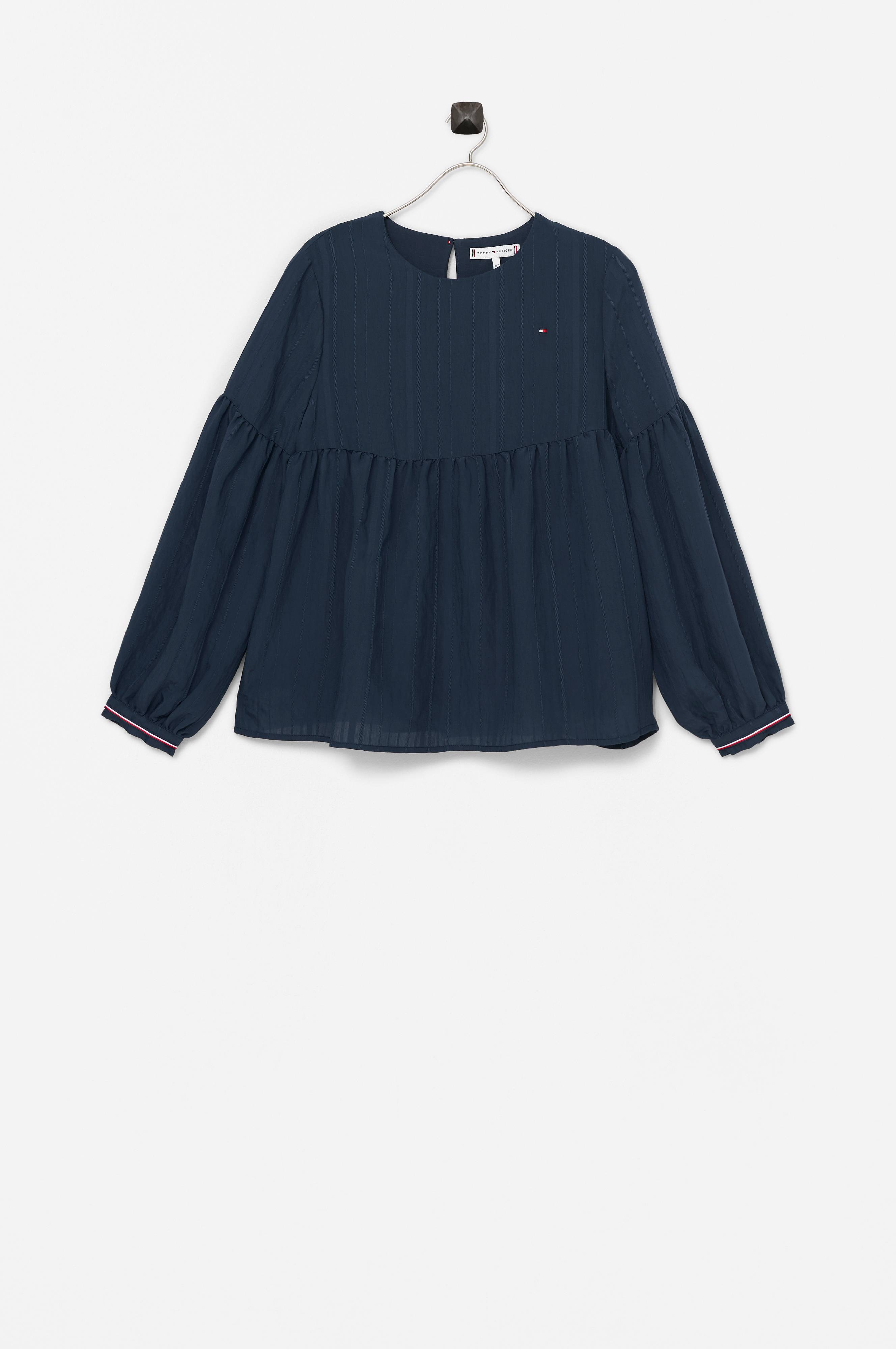 Topp i vävt tyg med strukturränder. Rund halsringning med sprund och knapp i nacken. Ballongärmar med knapp i ärmsluten. Avskärning i midjan med rynk runt om.