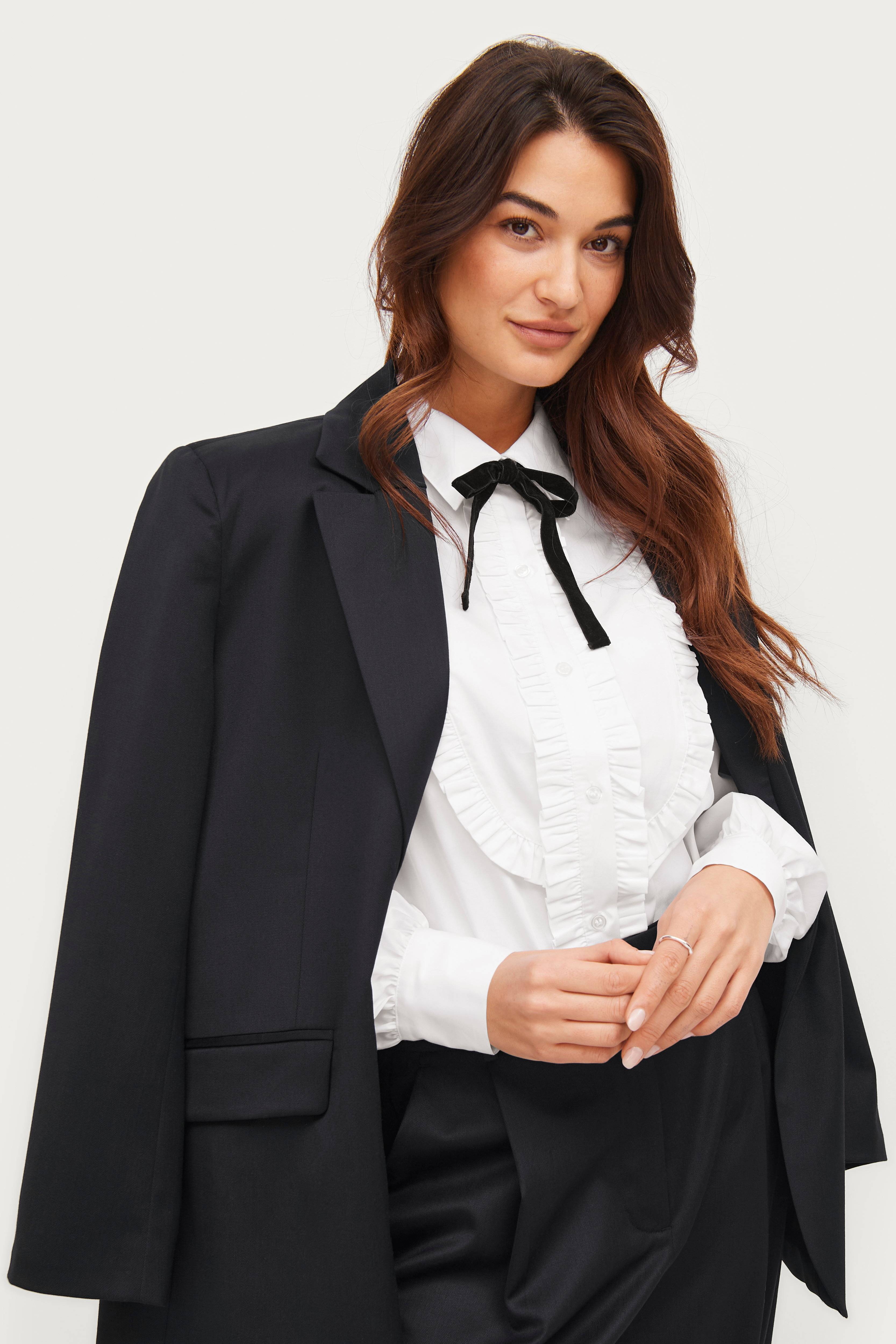 • Blus i bomull • Volangdetaljer fram • Löst knytband i sammet • Manschett med två knappar • Produkten innehåller ekologisk bomull som är odlad utan kemiska bekämpningsmedel, konstgödsel och genmodifierade grödor (GMO). Det innebär en mer hälsosam arbetsmiljö för bönder och bättre jordmån.