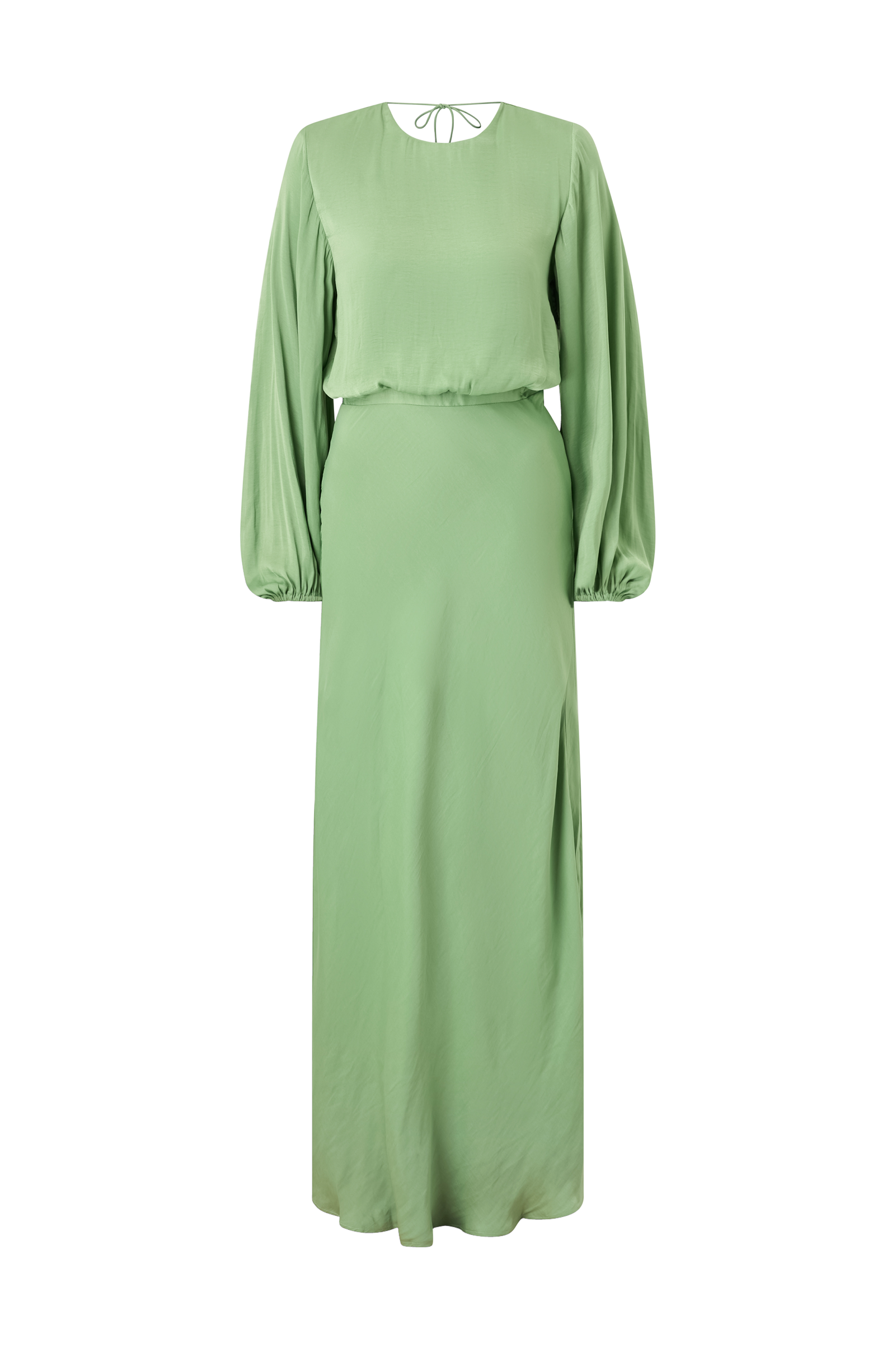 • Lång, elegant klänning• Kvalitet med lyster• Hög halsringning fram• Omlottdesign i ryggen• Vida, pösiga ärmar med elastiska ärmslut• Dold dragkedja i sidan• Axelvaddar• Vävt foder• Längd: 155 cm i storlek 36