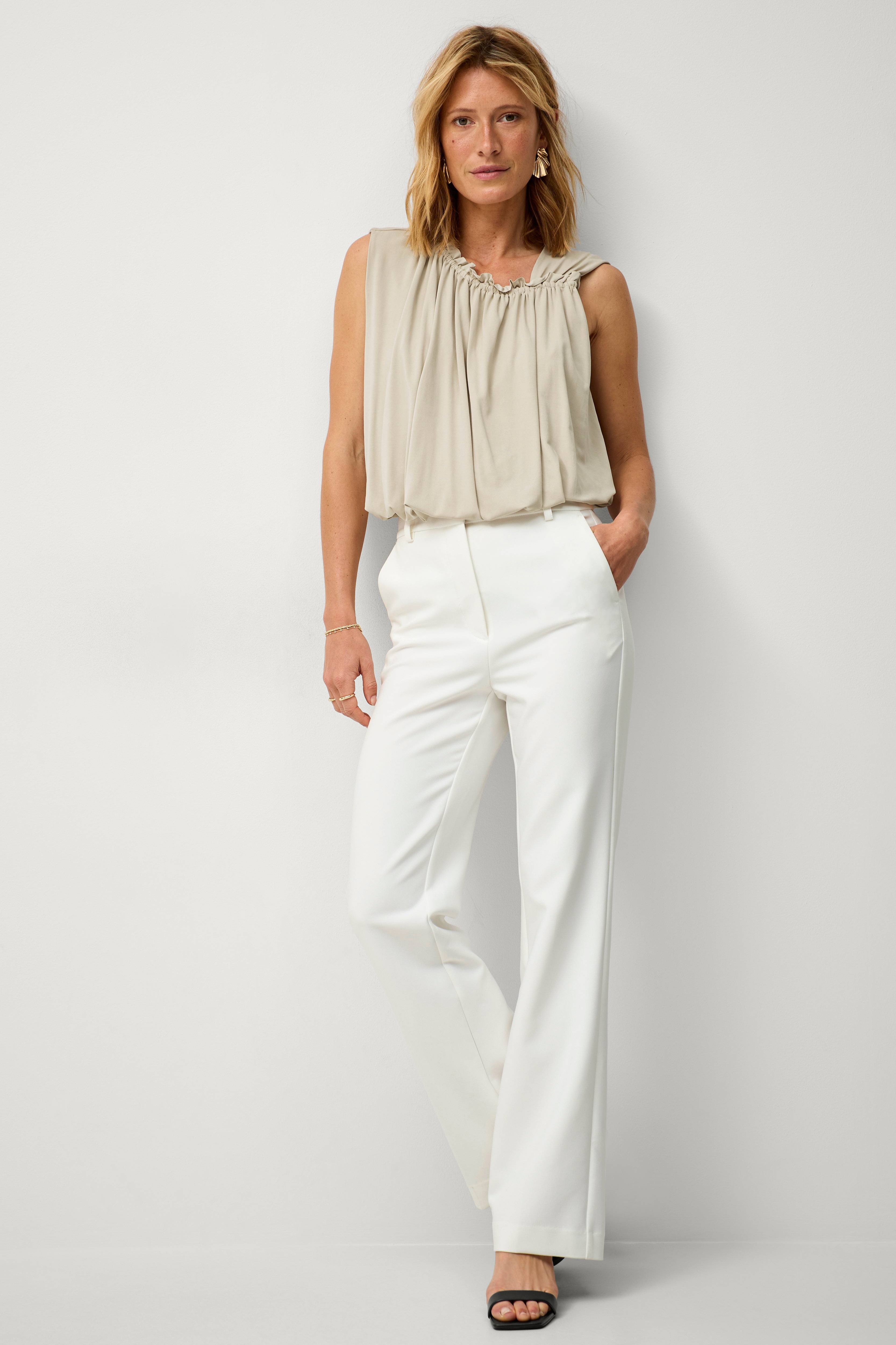 • Topp i mjuk modalblandning• Ärmlös modell• Draperad design• Rynkad halsringning med volang• Fodrad