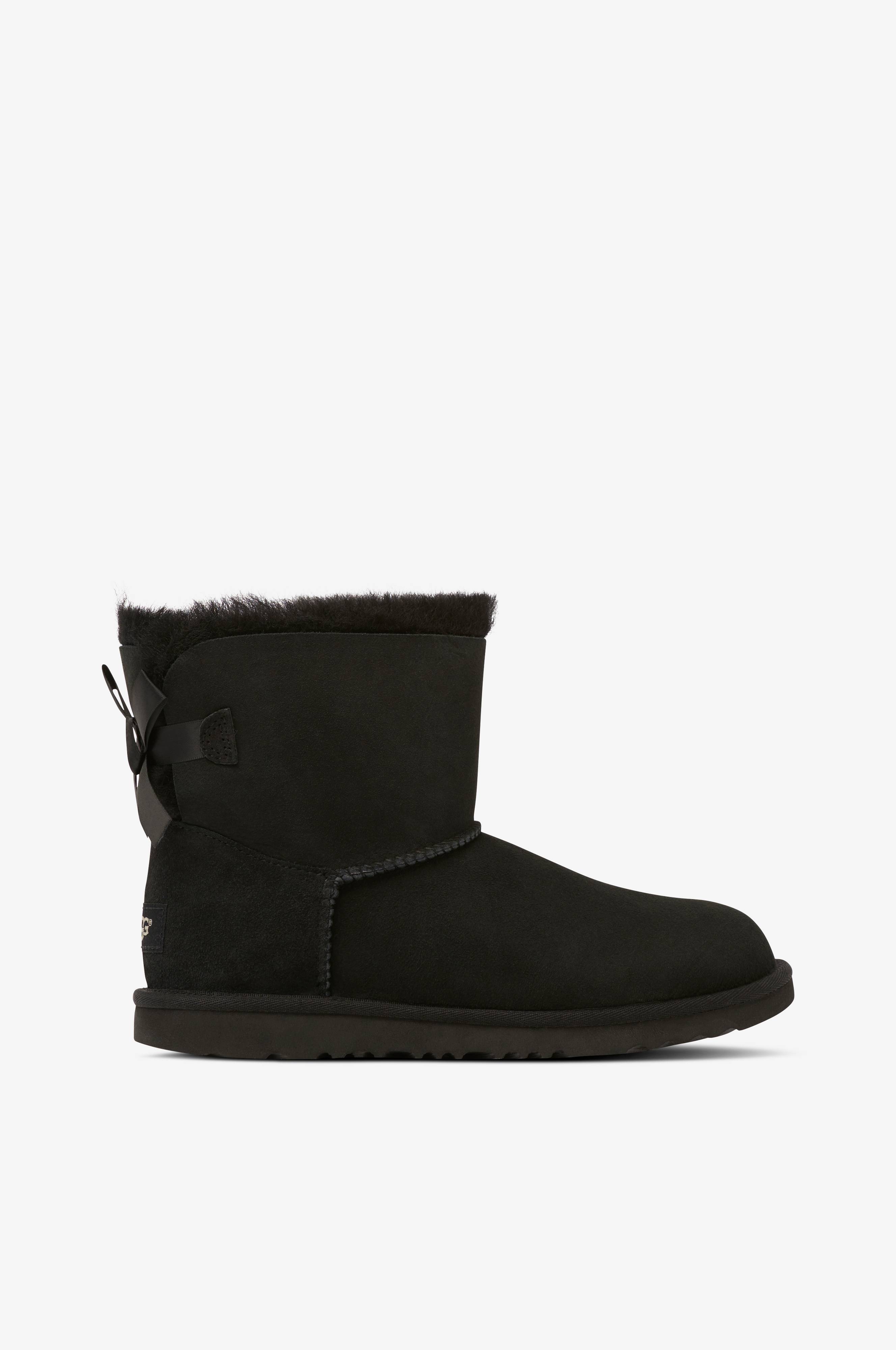 Boots K. Mini Bailey Bow II från UGG har fint och värmande fårskinnsfoder och en klassisk UGG-sula. Två sprund med rosett baktill på skaftet. Bootsen är i dra-på-modell. Vävt kantband runt sulkanten. Rundad tåform. Sulans höjd ca 2 cm.