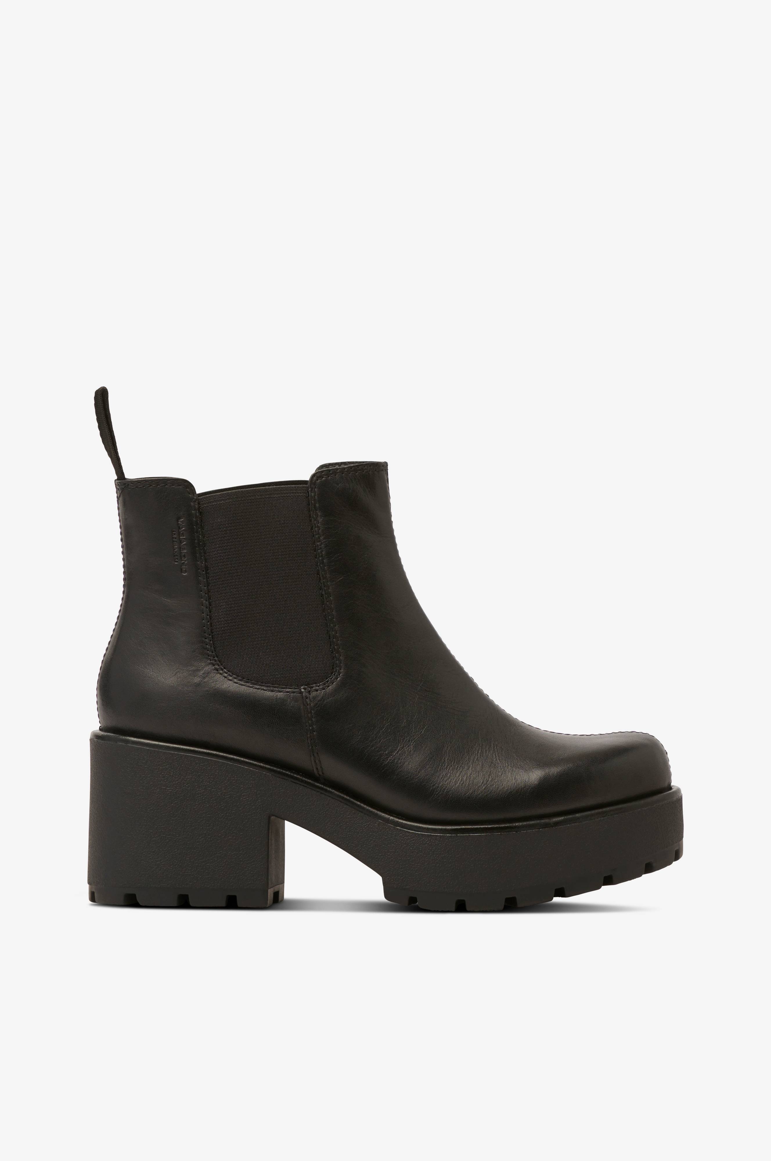Dioon från Vagabond är en högklackad boots med tyngdpunkten på sulan. Ovandelen är i fint skinn och har resårer på båda sidor om skaftet. Rundad tåform. Skafthöjd ca 10,5 cm mitt bak. Platå ca 3 cm. Klackhöjd ca 7,5 cm.