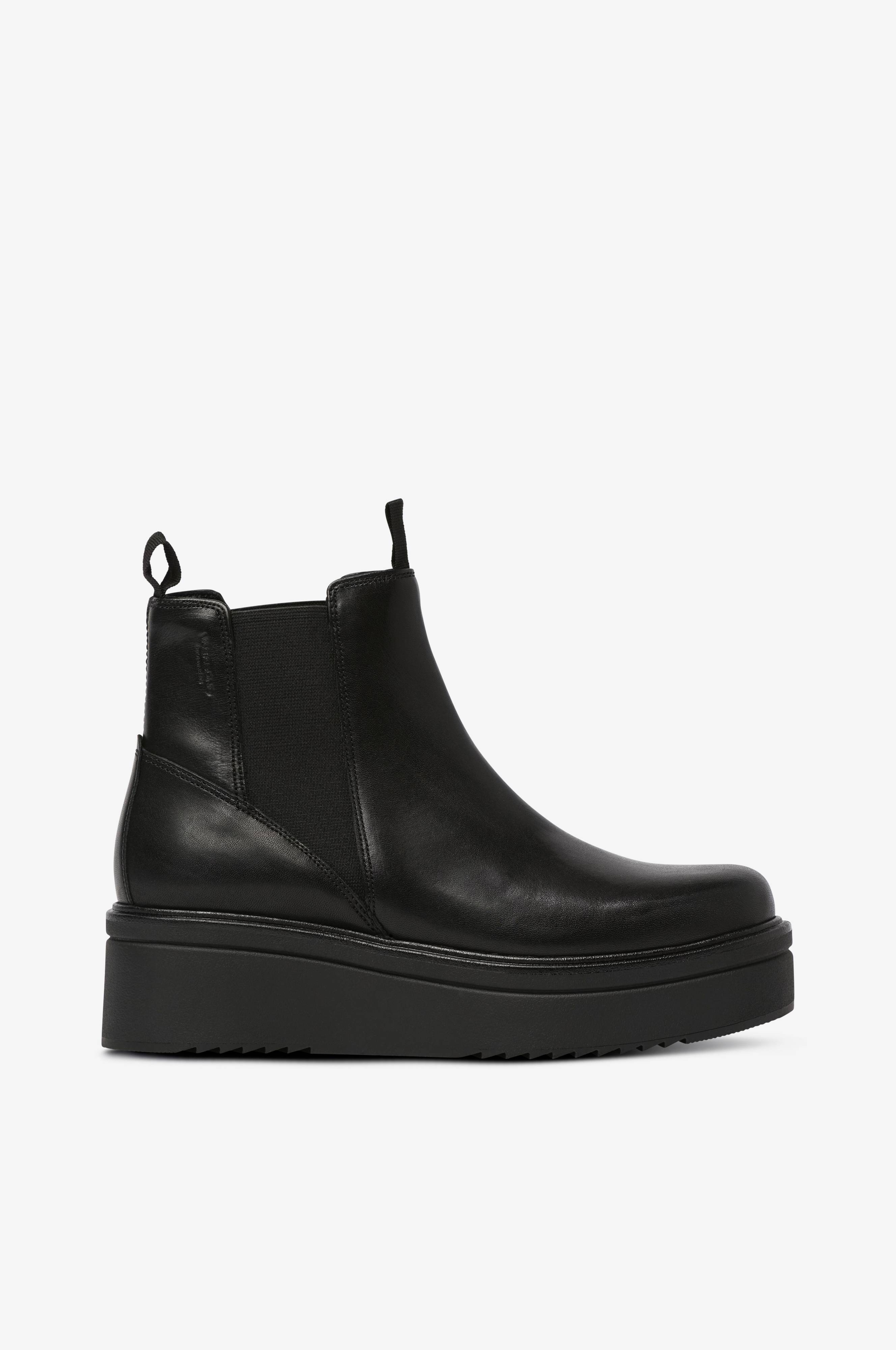 Boots i skinn med resårinfällningar på båda sidor om skaftet och hank upptill både fram och bak. Foder i textil och innersula i skinn samt hög yttersula.