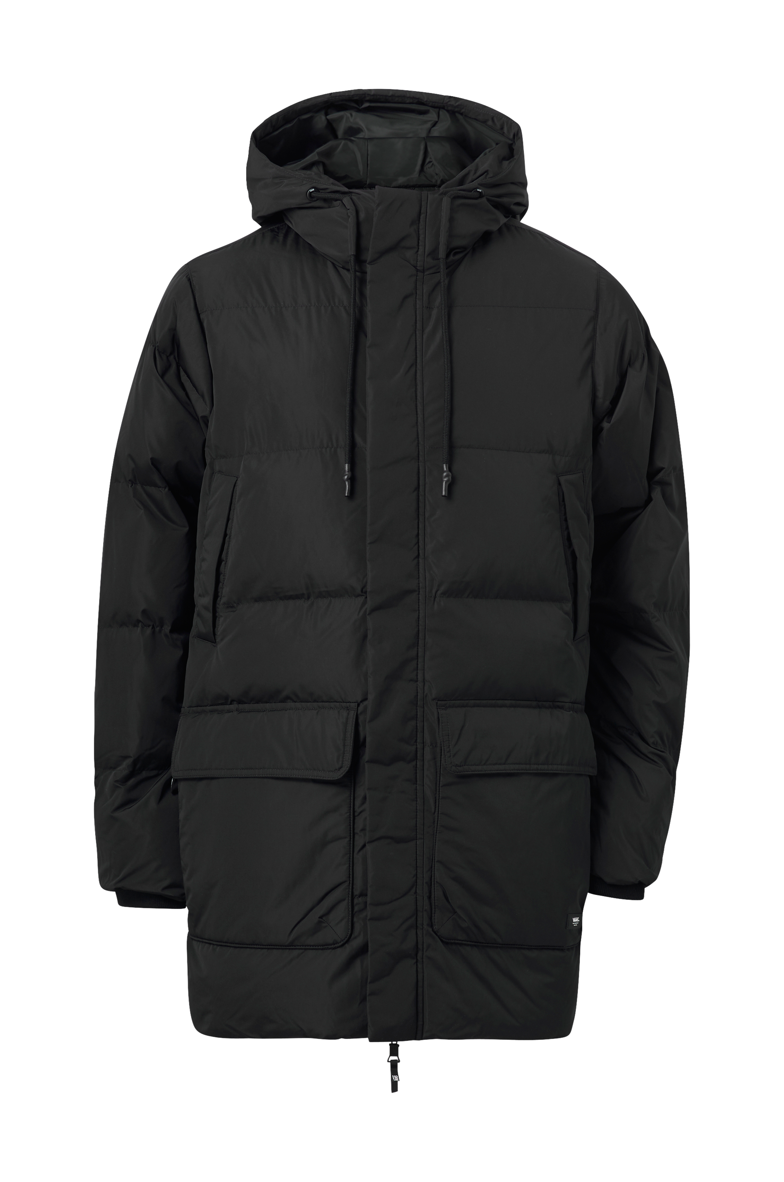 • Quiltad, vadderad jacka • Vattenavvisande yttertyg • Fast huva med dragsko • Tvåvägsdragkedja • Vindslå med kardborrestängning • Två stora fickor med kardborrestängning • Två sidfickor med dragkedja • Två bröstfickor • En innerficka med dragkedja • Ribbmuddar i ärmsluten • Längd: 87 cm i storlek M