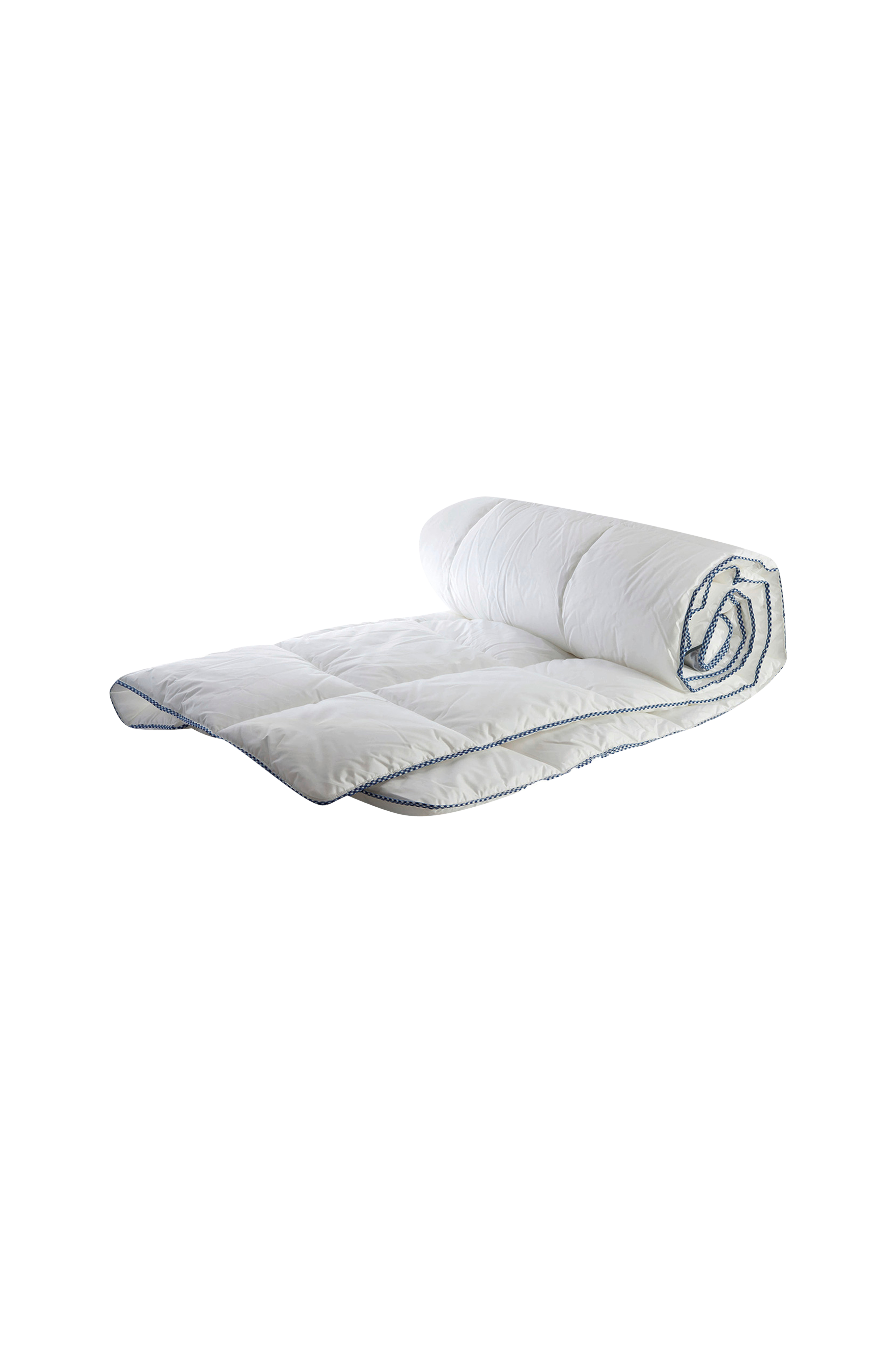 Ett exklusivt täcke i 100% ekologiskt bomullscambric. bomullscambric ger täcket en härlig krispig känsla, precis som hos ett hotelltäcke. Täcket är stoppat med softfiling, silikoniserad polyesterhålfiber av högsta kvalitet. Polyesterhålfiberns egenskaper ger täcket en oemotståndlig isoleringsförmåga och livslängd. Täcket är rutstickat och sydd med en blåvitrutig bandkant.