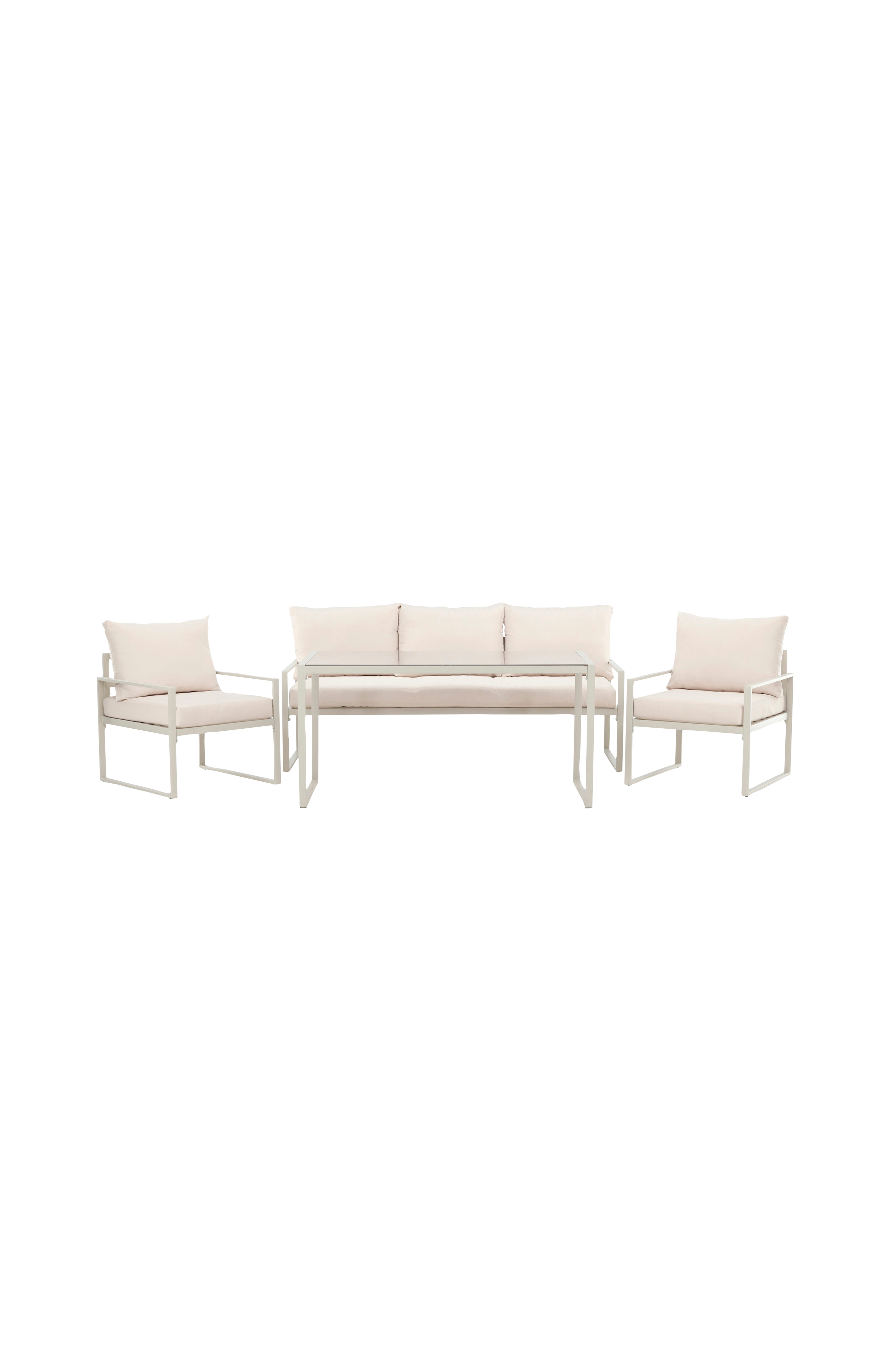 Catania är loungesetet som förvandlar din uteplats till en elegant och trendig oas. Setet består av två bekväma fåtöljer, en rymlig soffa och ett snyggt bord - allt utformat med fokus på både design och komfort. Med en stålram och mjuka beige dynor skapas en sofistikerad kontrast som ger en modern känsla till utemiljön.