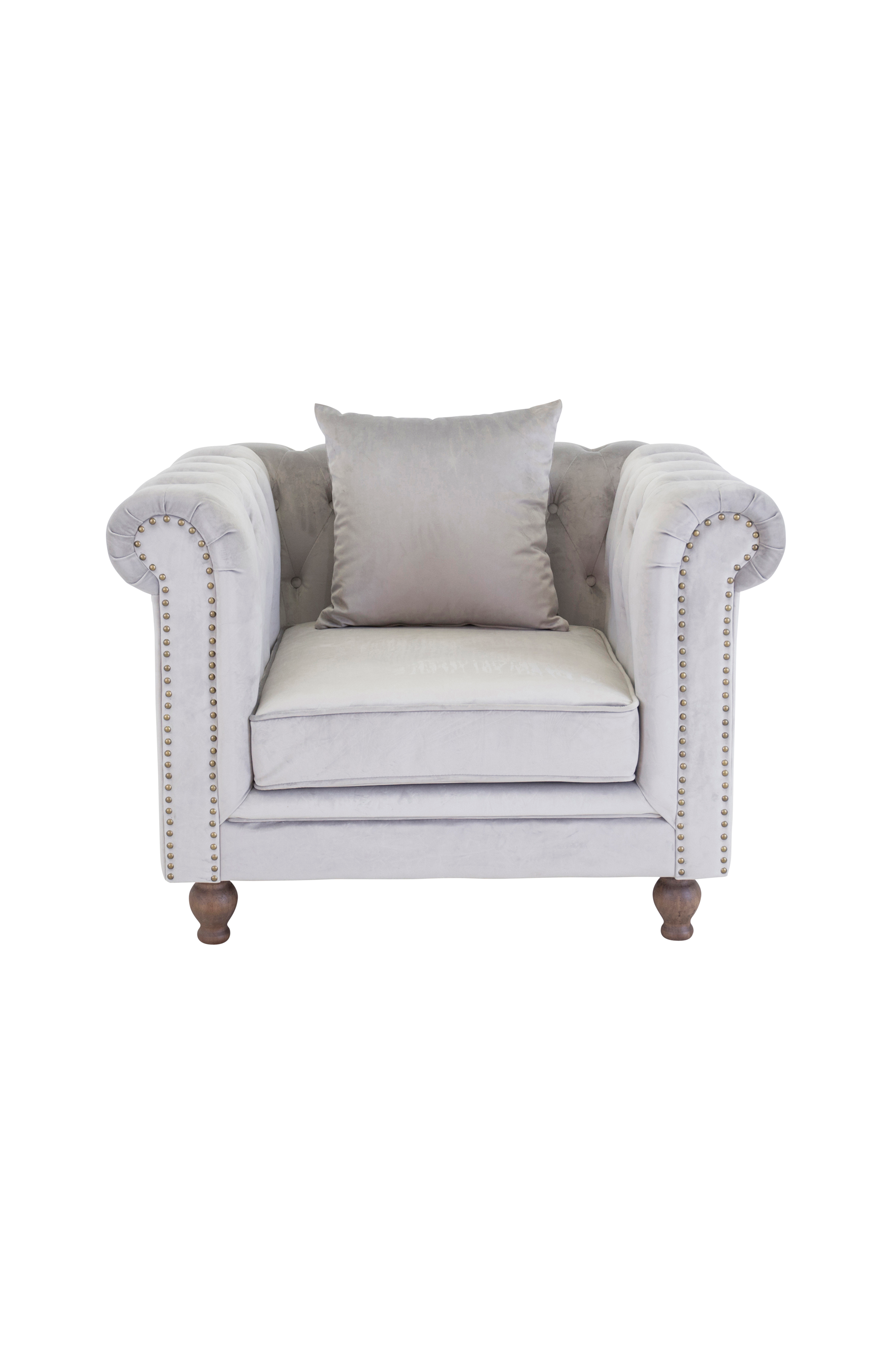 Stilfull fåtölj. Tillverkad i solid trä med mjukt sammetstyg.