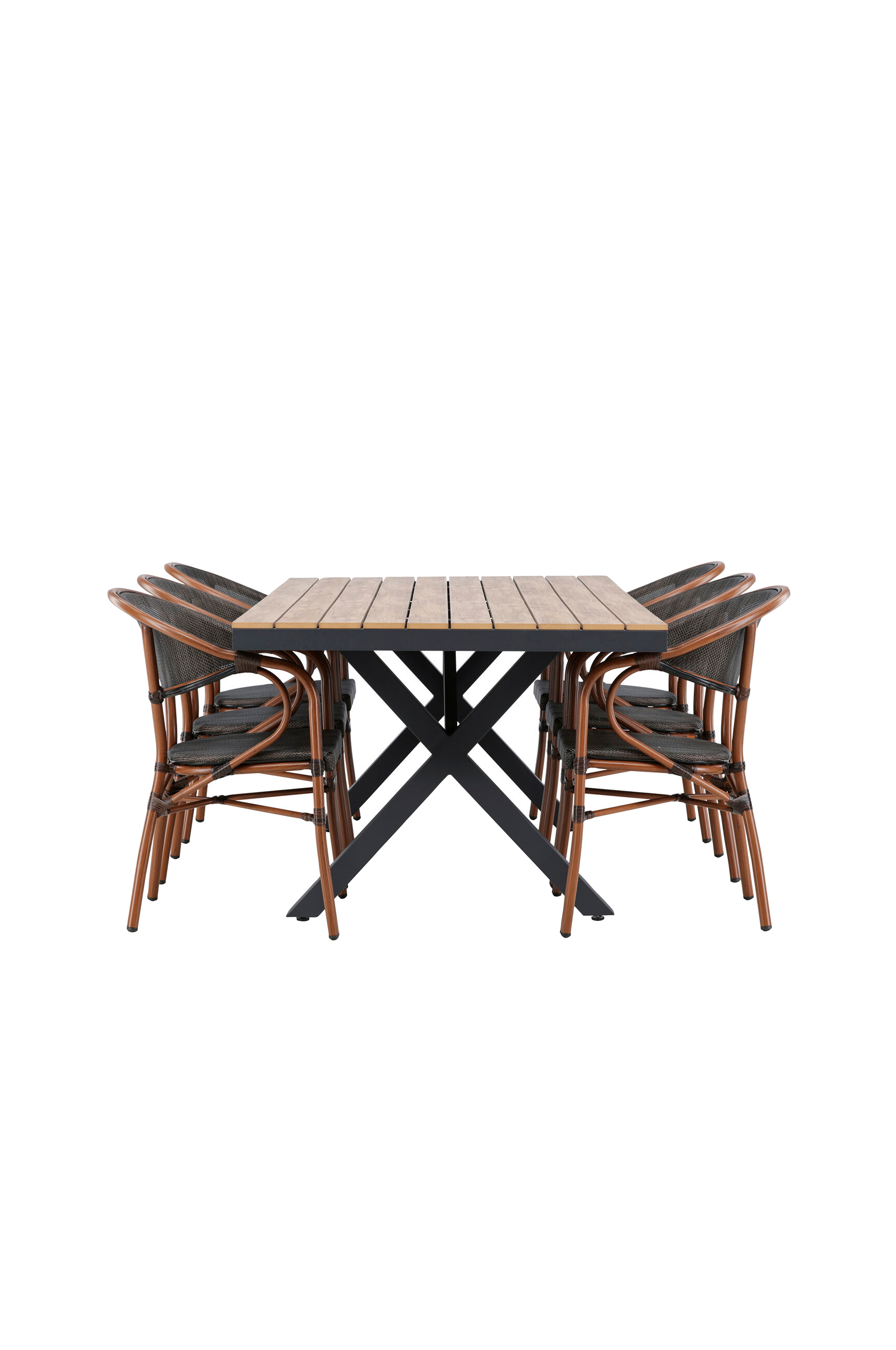 Denna matgrupp är idealisk för utomhusbruk och fungerar som en inredningsdetalj som samlar vänner och familj. Med sex stolar är setet komplett för att skapa minnesvärda stunder och njuta av avslappnade middagar utomhus.