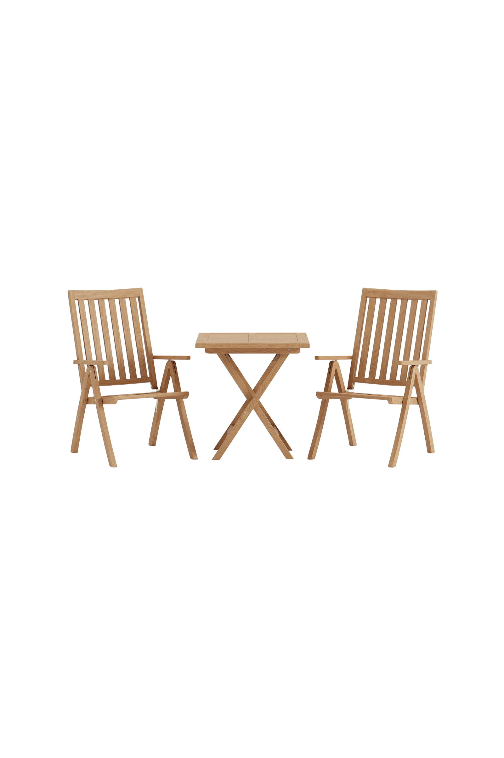 Skapa en stilfull fokuspunkt på din uteplats med denna charmiga matgrupp från kenyaserien. Här kombineras två eleganta matstolar i massiv teak med ett praktiskt, kvadratiskt cafébord i samma vackra träslag - perfekt för en mindre uteplats, balkong eller trädgårdshörna. Matstolen kenya har en tidlös lamelldesign med bekväma armstöd som gör varje sittningstillfälle extra behagligt. Ryggstödet kan ställas in i flera lägen, vilket möjliggör både upprätt sittande under måltiderna och mer avslappnade stunder i solen. En stol som snabbt blir en favorit tack vare sin kombination av design, funktion och komfort. Det hopfällbara cafébordet i teak är lika vackert som det är praktiskt. Den kvadratiska formen och lättviktskonstruktionen gör det enkelt att flytta, förvara och anpassa efter dagens behov. Perfekt för morgonkaffet, lunchen i solen eller ett mysigt kvällssnack utomhus.