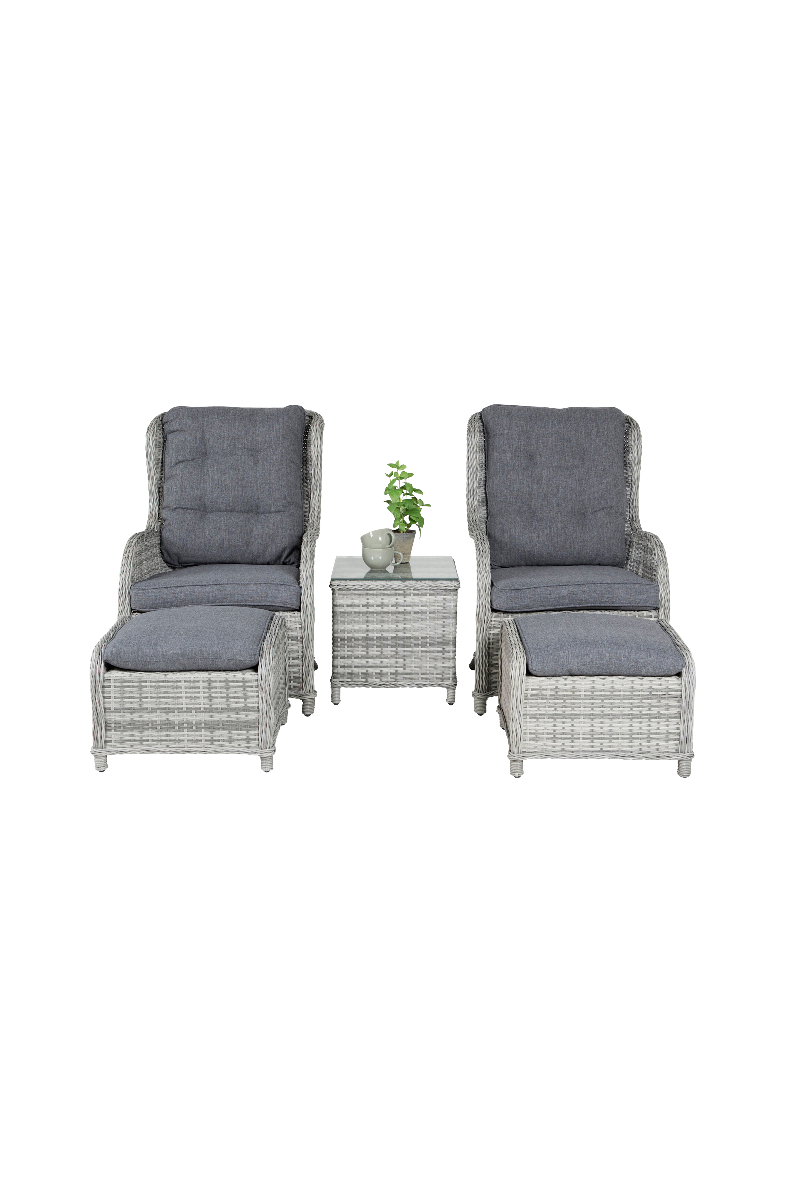 Lounge set bestående av två st öronlappsfåtöljer med fotpallar samt ett sidobord med glasskiva, allt i alumiumstomme med konstrotting och dyna