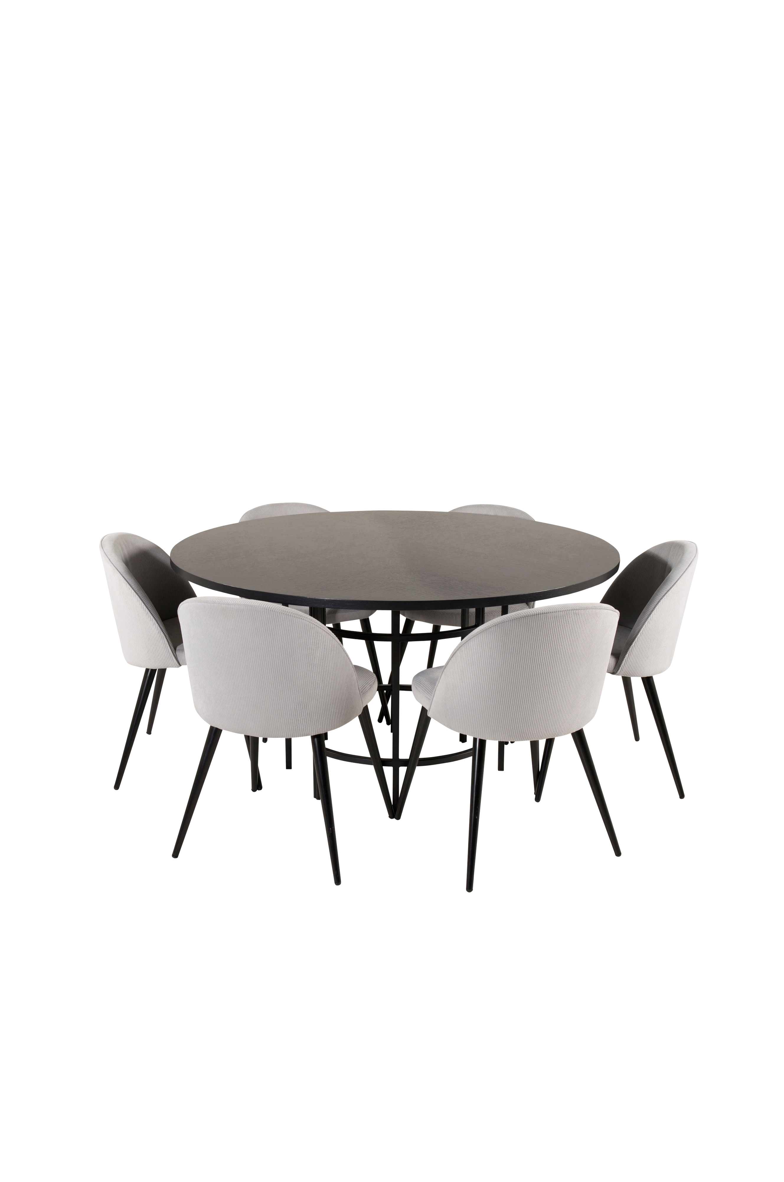Copenhagen Furniture Fashion matbord med en rund topp i MDF samt fanér och bordsben i metall. Bordets mått: Diameter: 140cm, Höjd: 74cm. Matchas med 6st Venture Design Valleta matstolar i manchester och stolsben i metall. Stolens mått: Totalhöjd: 77cm, Bredd: 49,5cm, Djup: 54,5cm, Sitthöjd: 47cm. Bord och stol kräver enklare montering.