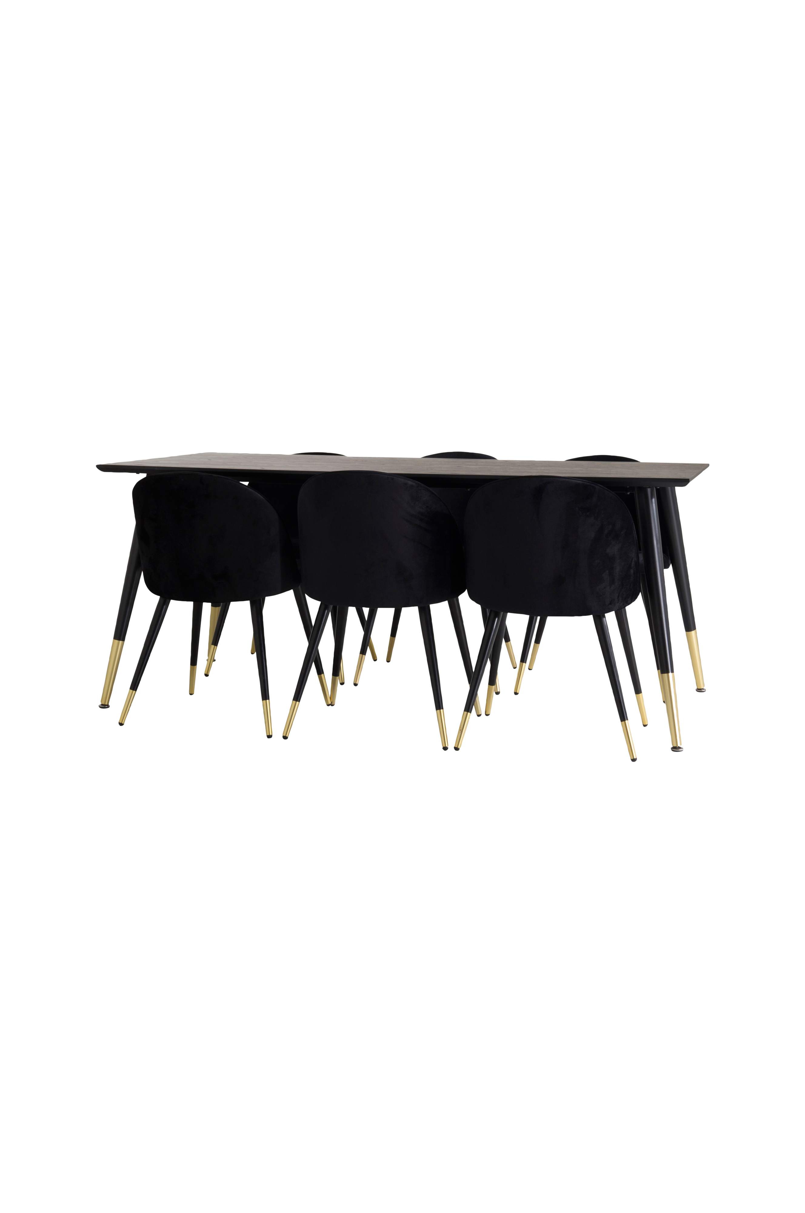 Doris är en matgrupp med ett rektangulärt stilrent matbord med en pulverlackerad MDF skiva som bordsskiva och mässingfärgade detaljer på benen. Bordets mått 90 x 180, höjd 75 cm. Matchas med 6 st stolar klädda i sammetstyg och med mässingsdetaljer på de svarta stolsbenen. Mått stol, höjd 77, djup 54,5, bredd 49,5 cm. Sitthöjd 47, sitt djup 43 cm. Bordet och stolarna kräver enklare montering.