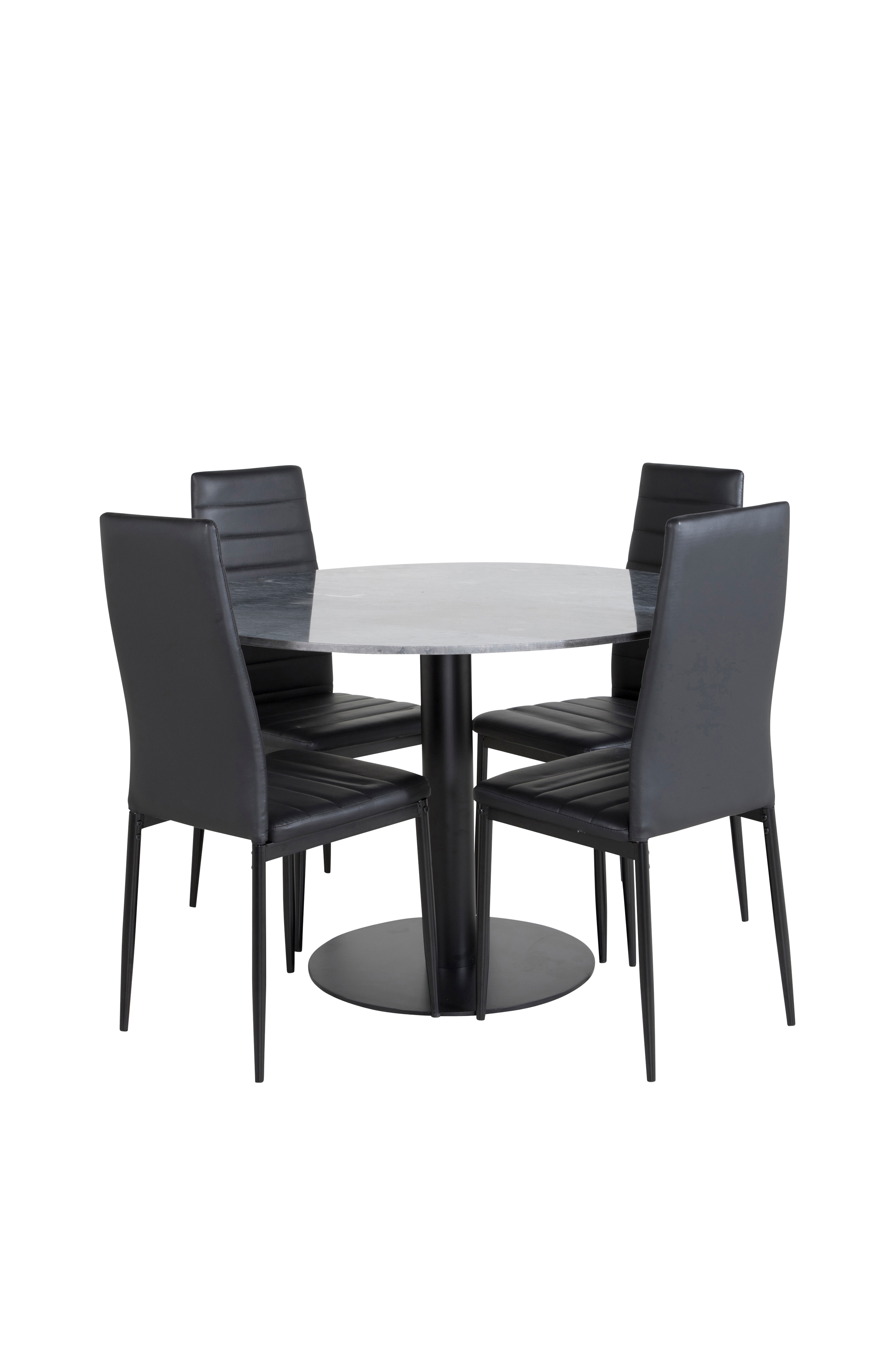 Estri matbord med en rund topp i marmor och bordsben i metall. Matchas med 4st Sandviken matstolar med stolsits i konstläder och stolsben i metall. Bord och stol kräver enklare montering. Bordets mått: Diameter: 106cm, Höjd: 75cm. Stolens mått: Sittdjup: 39cm, Sittbredd: 42cm, Sitthöjd: 46cm.