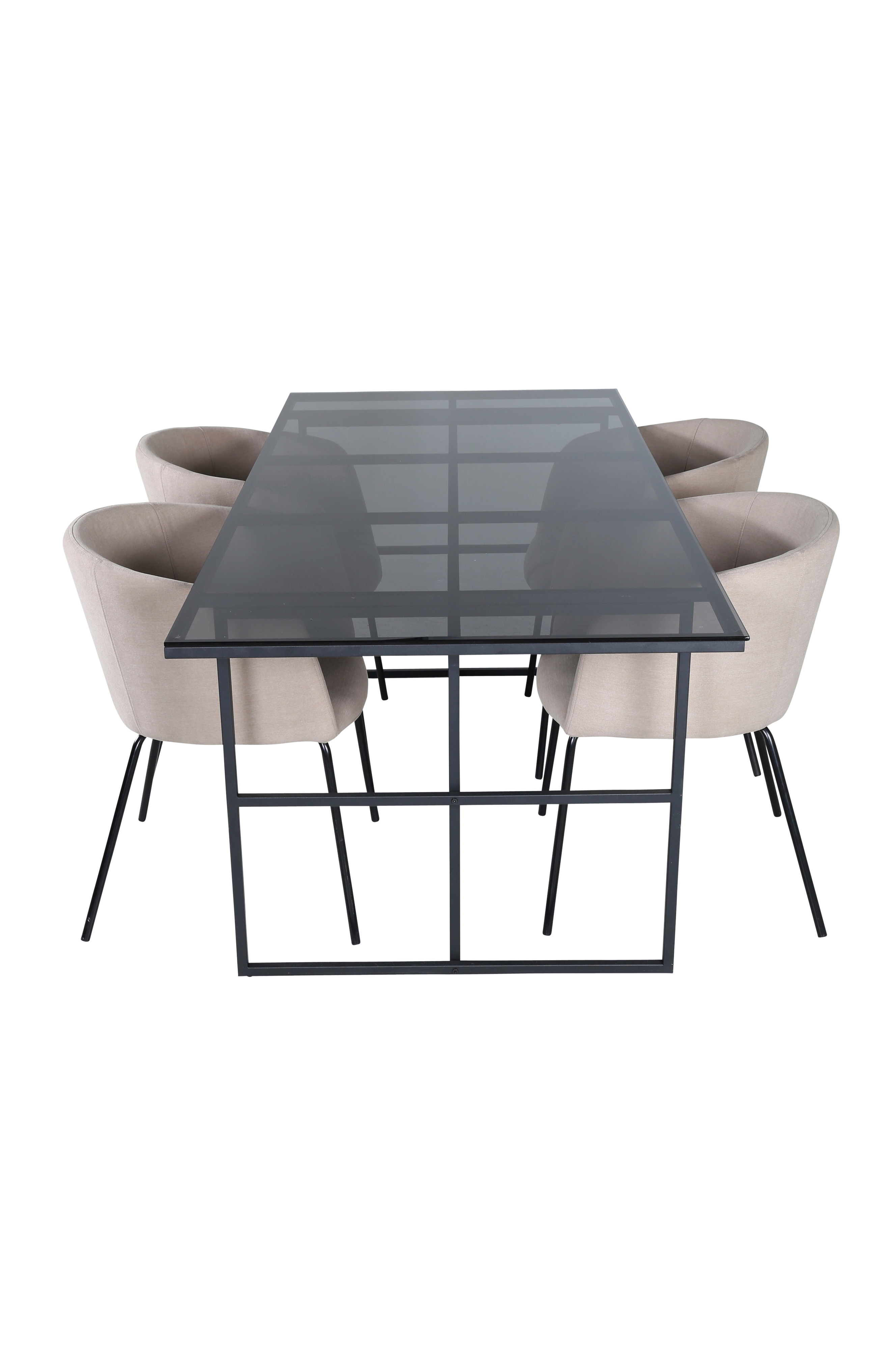 Leif matbord med en bordstopp i glas och bordsben i metall tub. Matchas med 4 st Berit matstolar med stolsits i polyester linne och stolsben i järn. Bord och stol kräver enklare montering. Bordets mått: Längd: 200 cm, bredd: 90 cm, höjd: 74 cm. Stolens mått: Sittdjup: 45 cm, sittbredd: 55 cm, sitthöjd: 49 cm.
