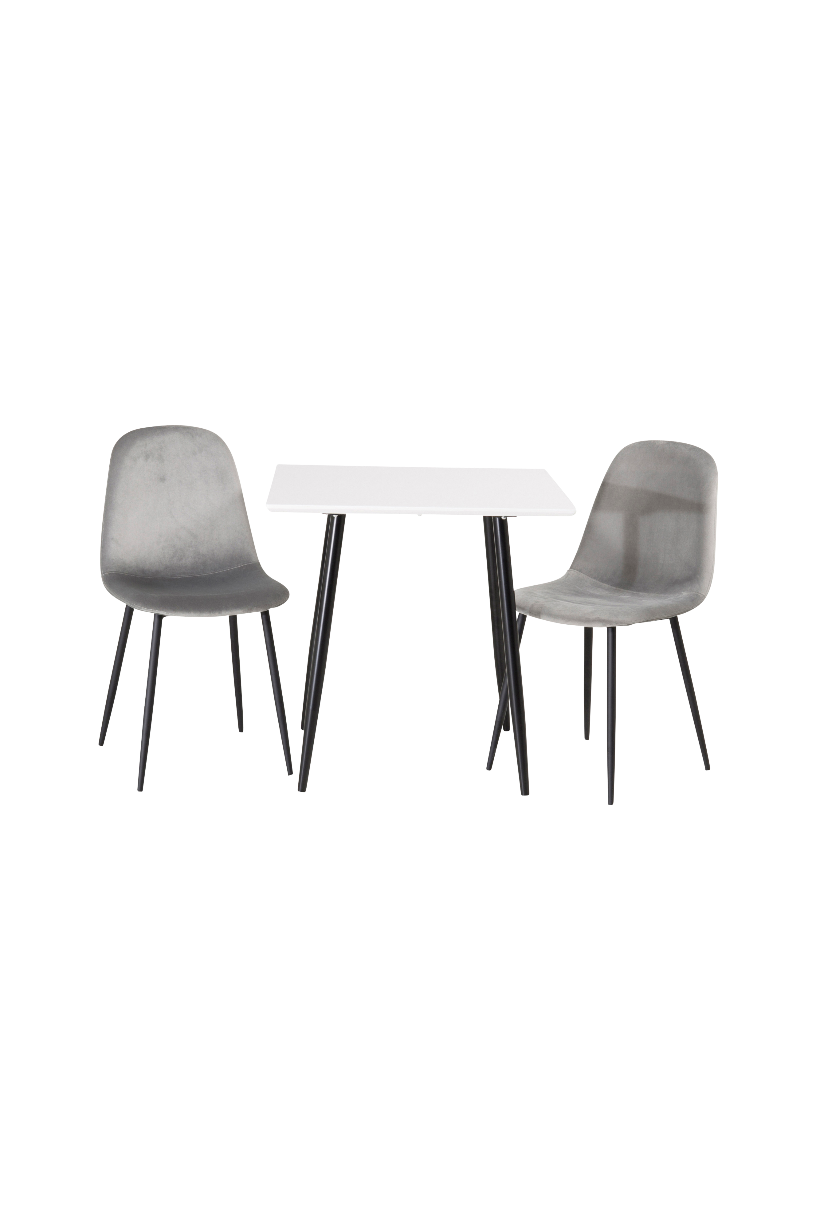 Penally matbord med en topp i MDF och bordsben i järn. Bordets mått: Längd: 80cm, Bredd: 80cm, Höjd: 75cm. Matchas med 2st Penally matstolar i sammet och stolsben i metall. Stolens mått: Totalhöjd: 88cm, Bredd: 42,5cm, Djup: 53,3cm, Sitthöjd: 41,5cm. Bord och stol kräver enklare montering.