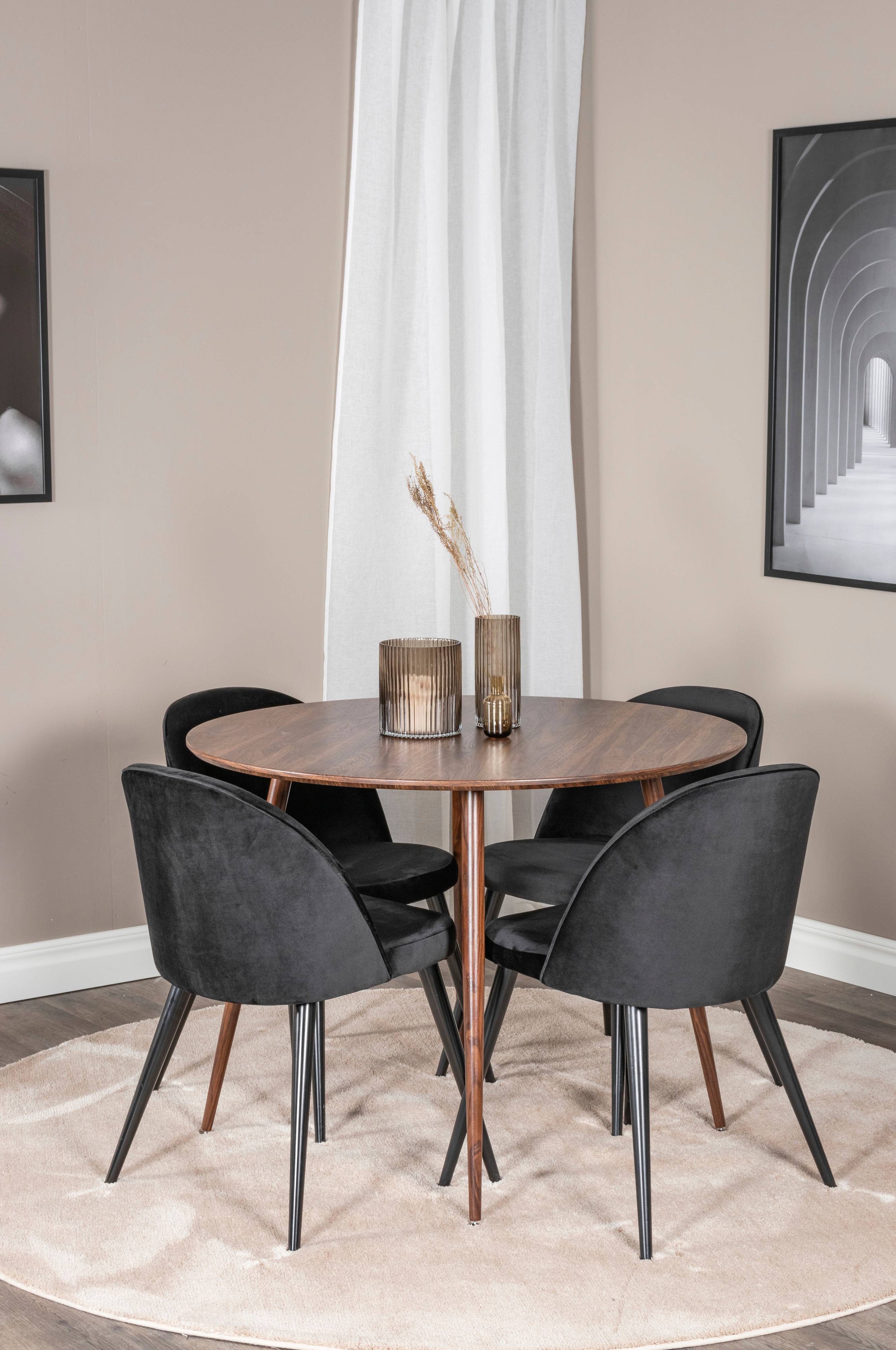 Pia matbord med en rund topp i MDF med valnötsfolering och bordsben i metall med valnötsfolering. Matchas med 4st Valleta matstolar med stolsits i sammet och stolsben i metall. Stolens mått: Sittbredd: 41cm, Sittdjup: 42.5cm, Sitthöjd: 46.5cm.Bord och stol kräver enklare montering.