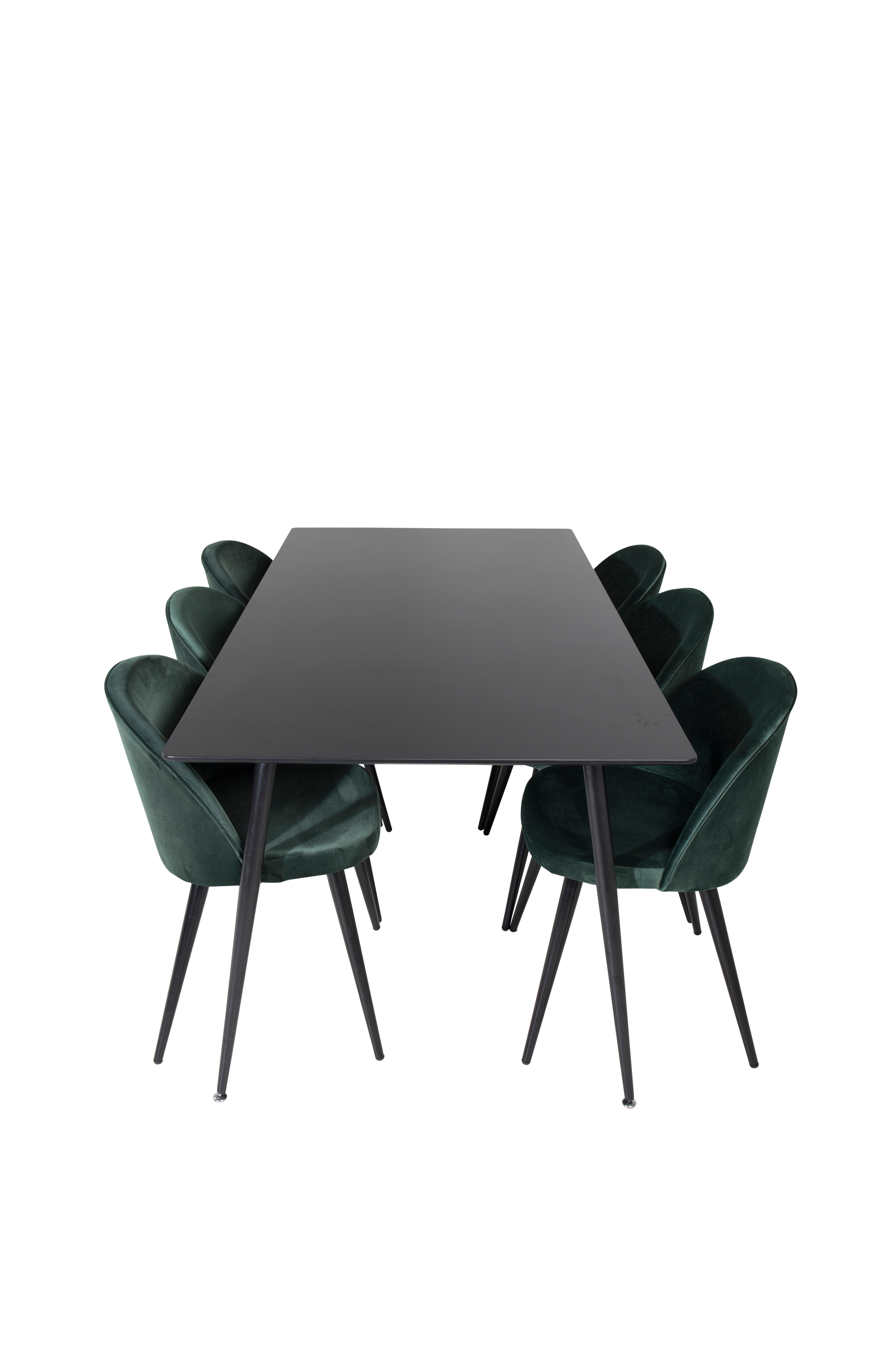 Silar, modernt och snyggt matbord – här tillsammans med gröna matstolar i serien Velvet. Här finns plats för många – bjud in till trevliga familjemiddagar!