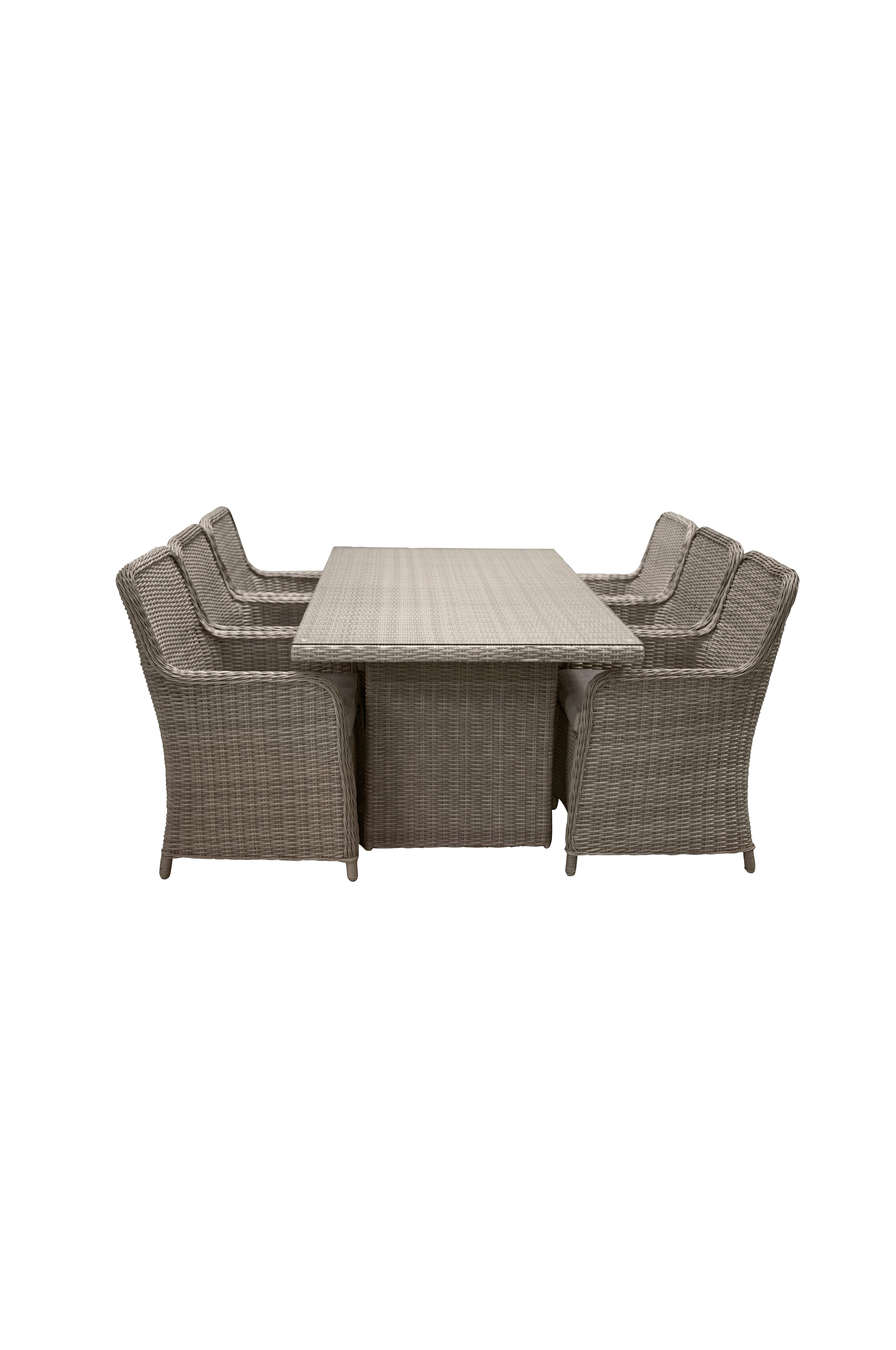 En bekväm matgrupp med alla rätt; slitstark, stilren och praktisk för alla tillfällen! Den här matgruppen från serien Wembley inkluderar ett matbord i konstrotting med en bordsskiva i glas och sex stycken bekväma fåtöljer. Genomgående i en jordnära kulör. Möblera uterummet eller trädgården inbjudande och bekvämt i sommar!