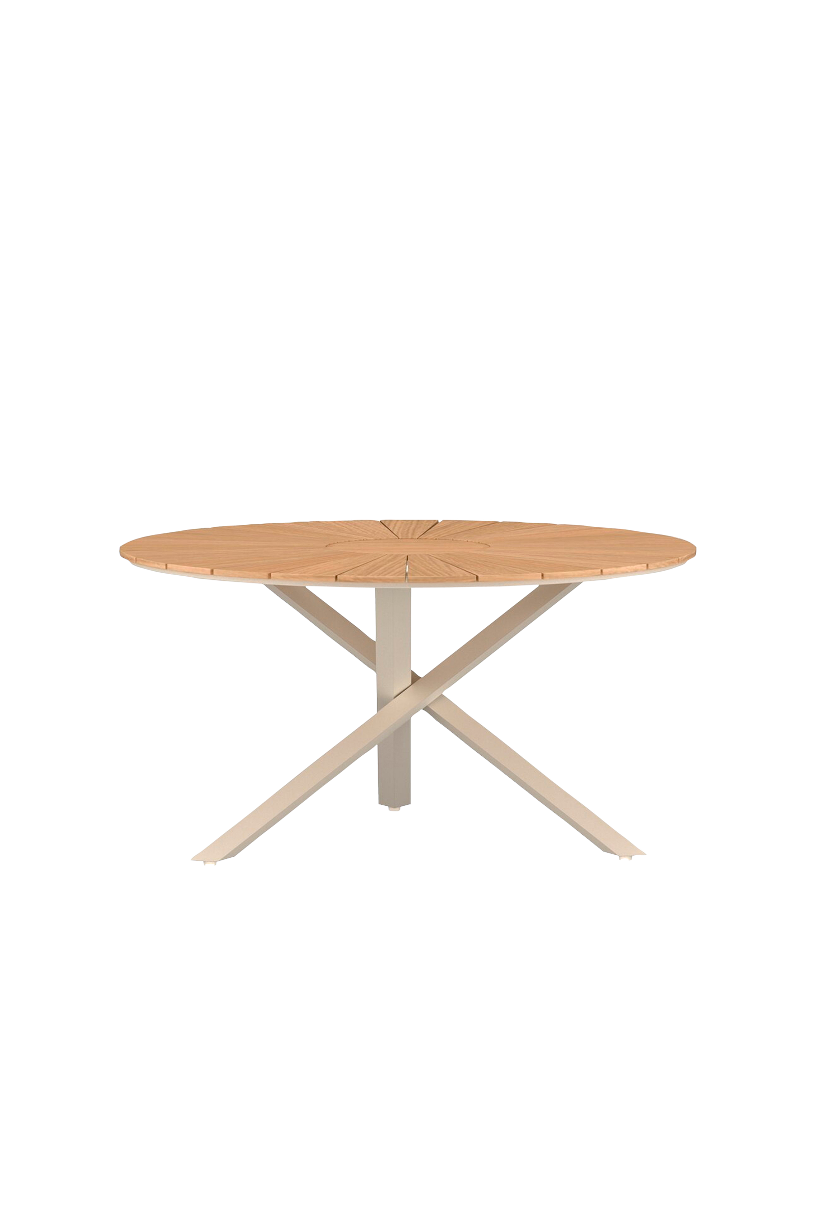 Mexico matbord är ett elegant runt bord som kombinerar modern design med naturliga material. Bordet har en beige aluminiumram och en vacker bordsskiva i teak med ett fläktinspirerat mönster som ger en exklusiv touch. Tack vare sin runda form blir bordet en naturlig samlingspunkt för måltider och umgänge, samtidigt som teakytan ger värme och karaktär. Mexico matbord är det perfekta valet för dig som vill ha en stilren och tidlös uteservering.