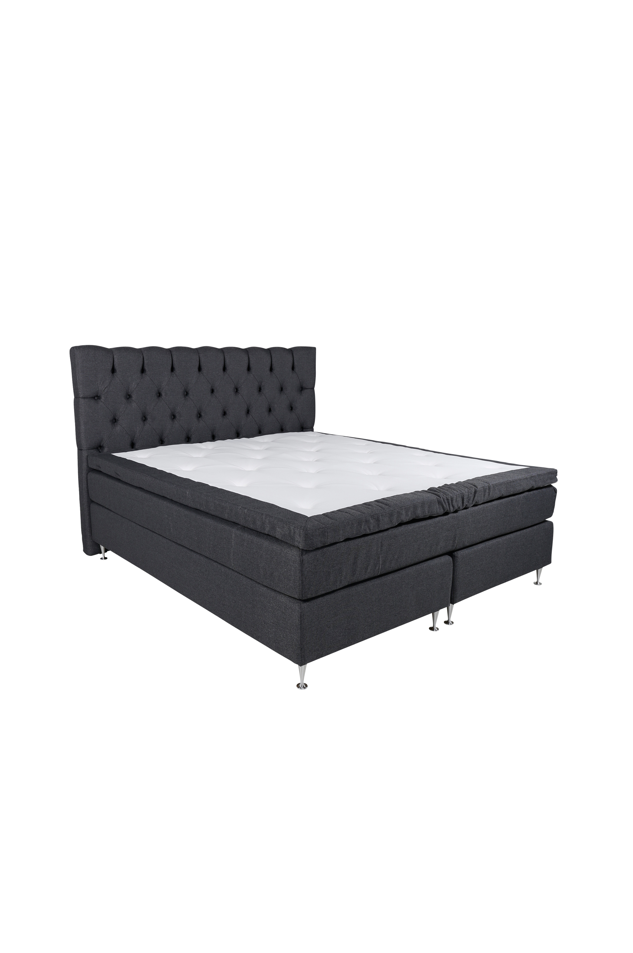 Sammantaget är sängen uppbyggd för att ge en skön sovkomfort samt ge ett enhetligt intryck i sin helklädda design. Hela sängen vilar på champangeben i silvrig aluminium.