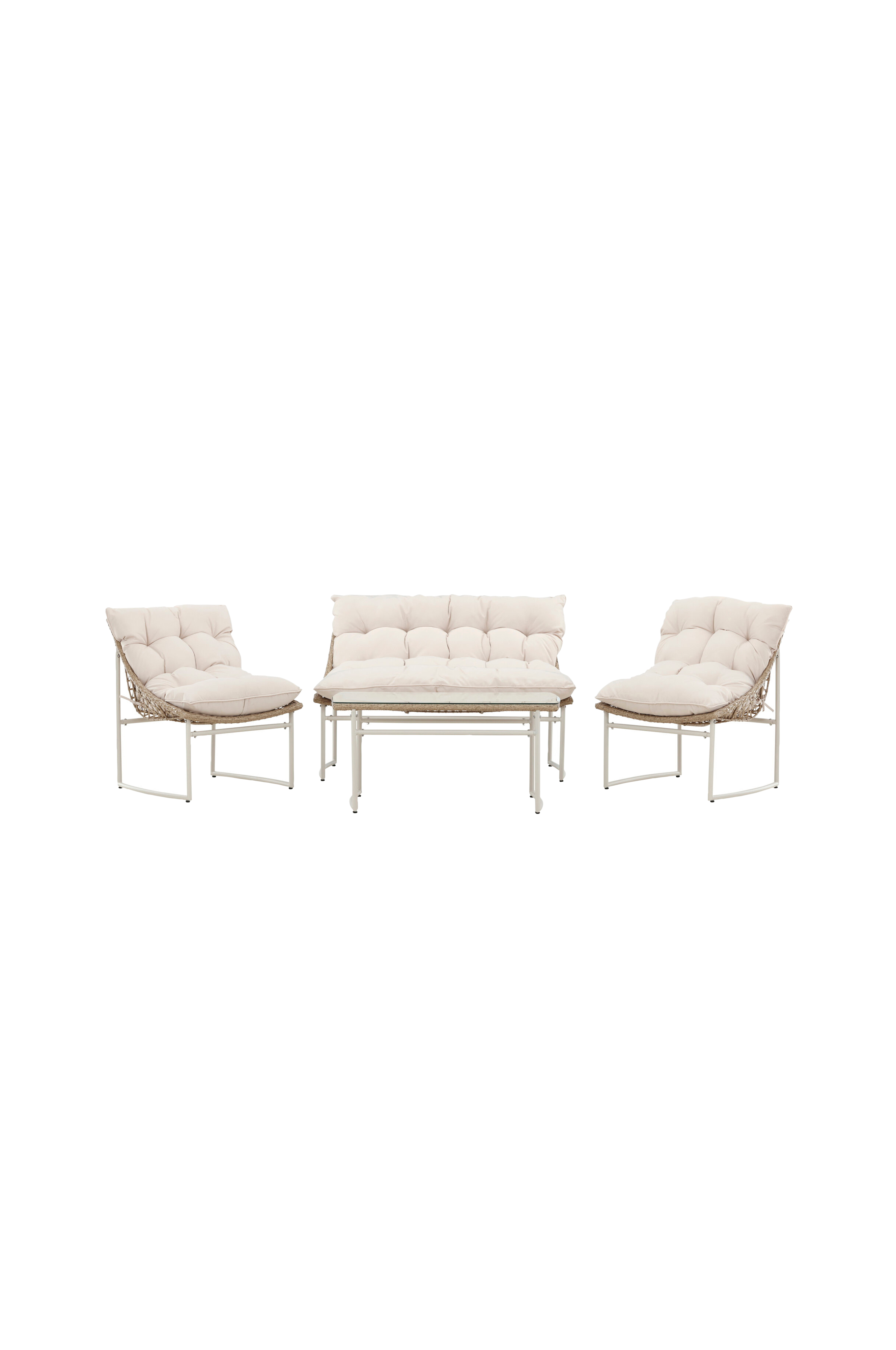 sittmöblerna är designade med en robust stålram och har en sits i konstrotting, kompletterad med snygga beige dynor som inbjuder till långa, avkopplande stunder. I färgerna natur och vit ger soffgruppen tina en trendig men ändå tidlös look som passar in i de flesta miljöer. Med sin blandning av naturmaterial och modern design är tina soffgrupp den perfekta lösningen för dig som vill skapa en bekväm och stilren loungeyta utomhus.