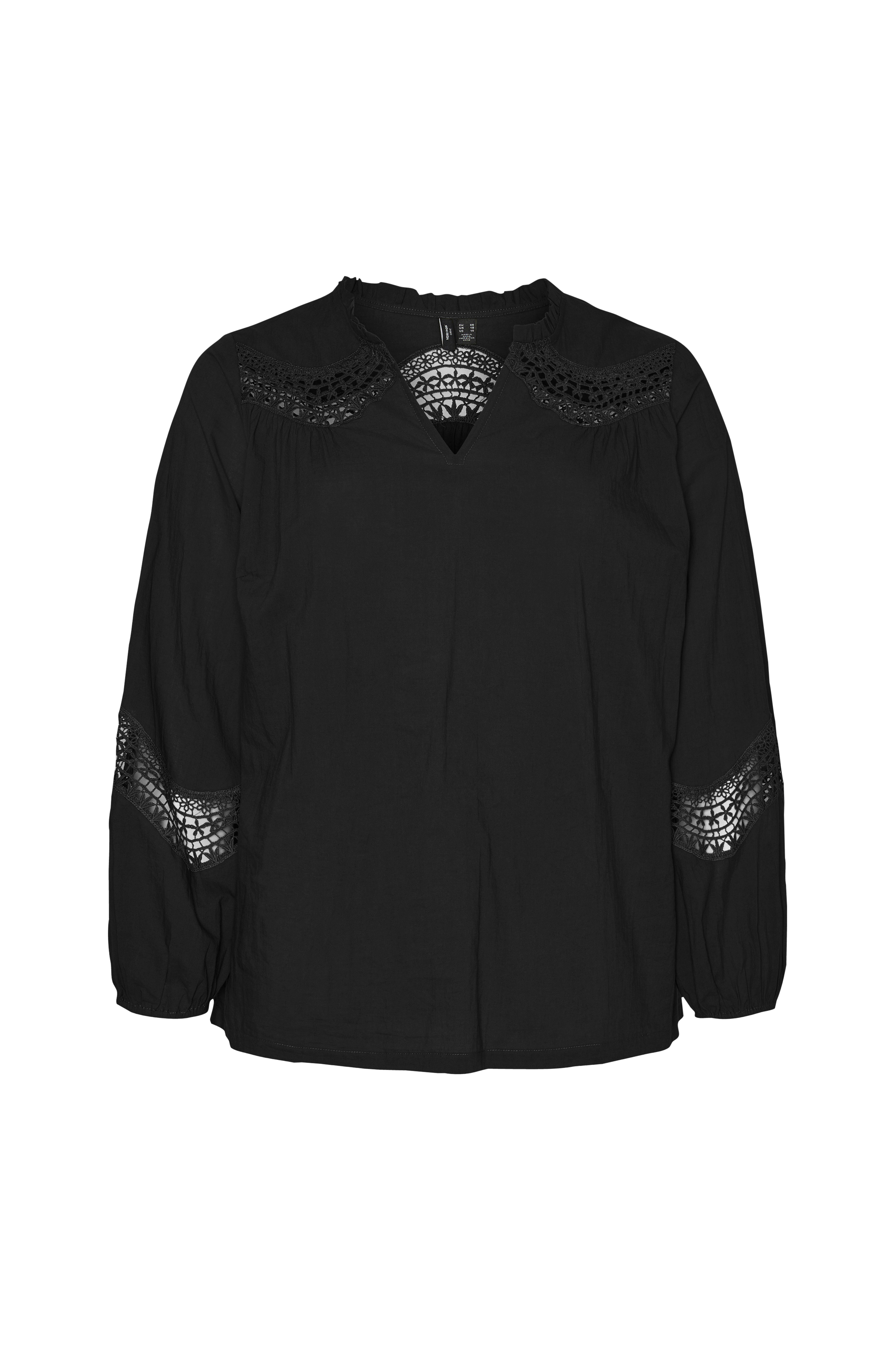 • Rak modell med infälld spets upptill och på ärmarna• Rund hals med liten volang och sprund fram• Lång, vid ärm med resår i ärmsluten