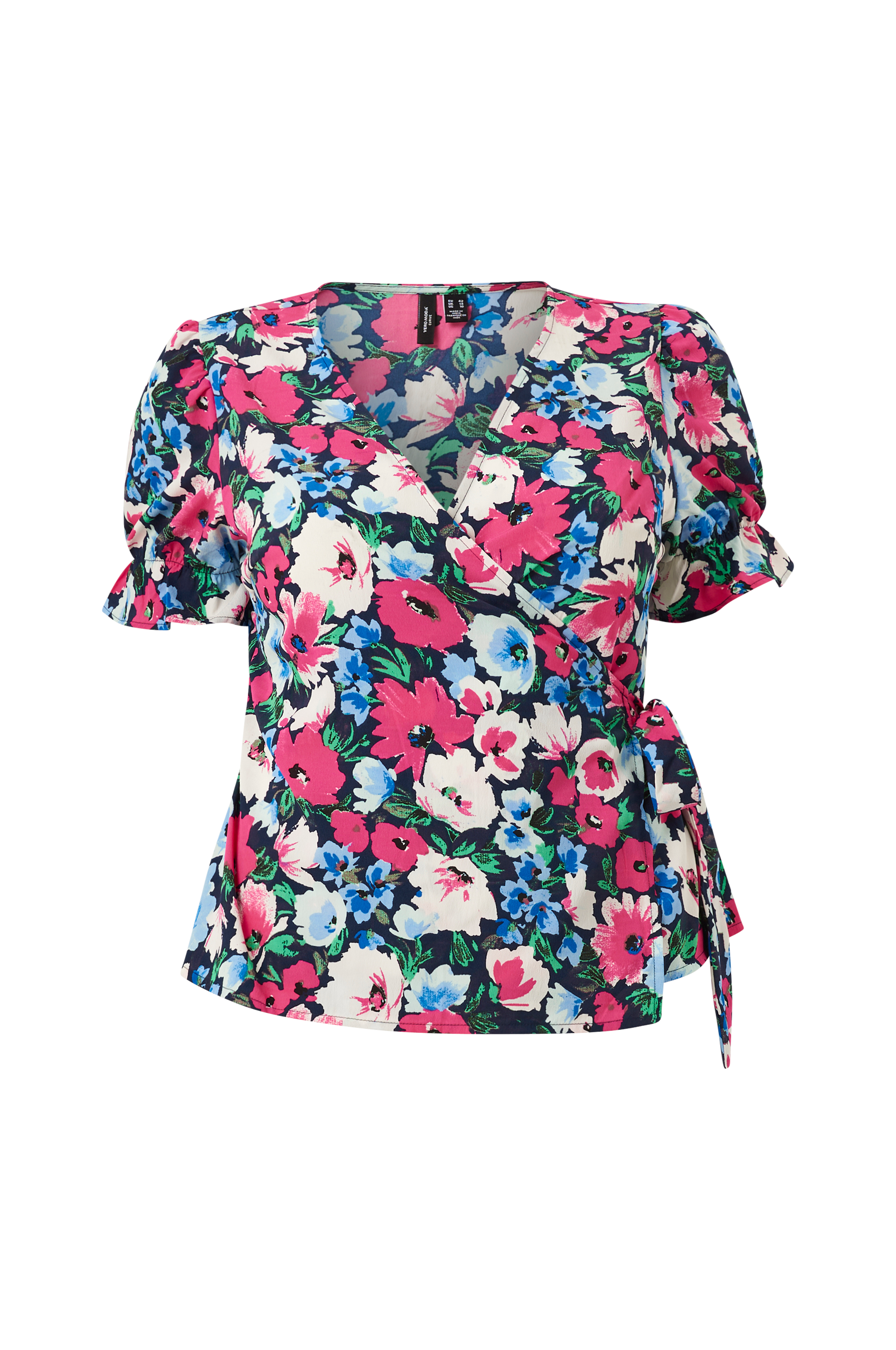Blommig blus med omlottdesign och knytband i sidan. Korta puffärmar med volang i ärmsluten.