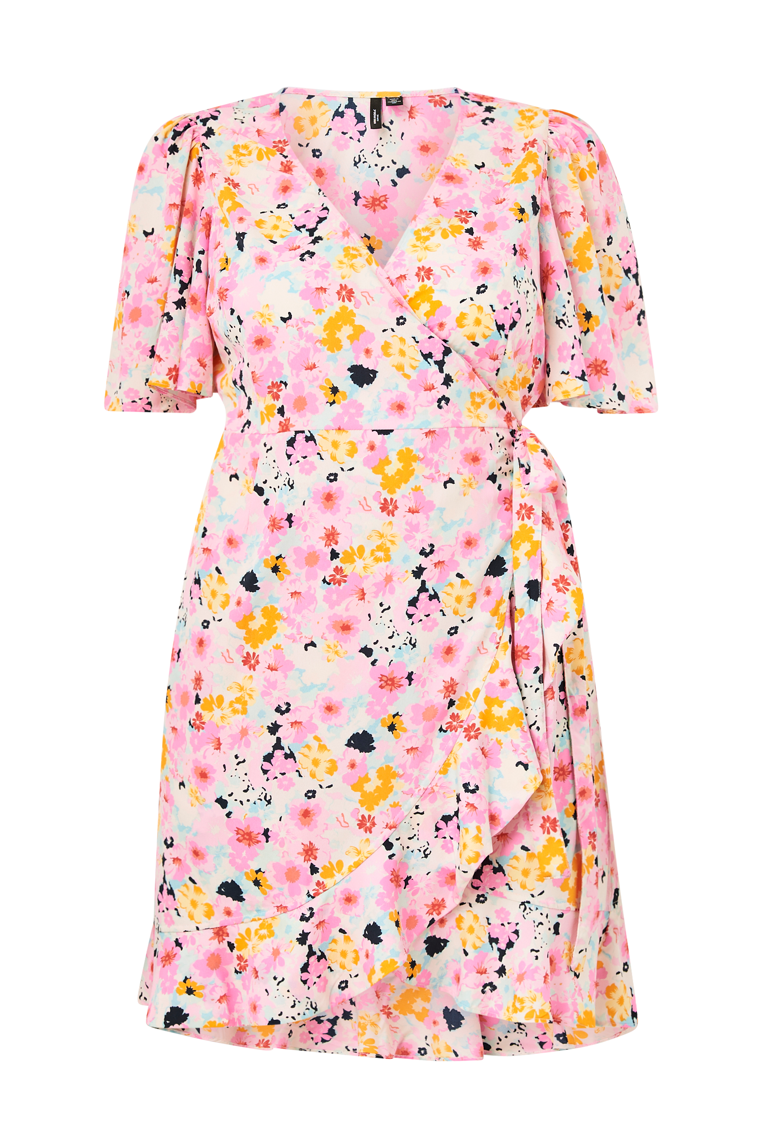 • Omlottdesign med knytband i sidan • Korta fjärilsärmar med rynk vid axlarna • Volang i nederkanten • Plusstorlekar • Längd: 101 cm i storlek 42 • Produkten innehåller återvunnet material som har tagits tillvara för att minska mängden avfall, samtidigt som nya resurser inte har förbrukats.