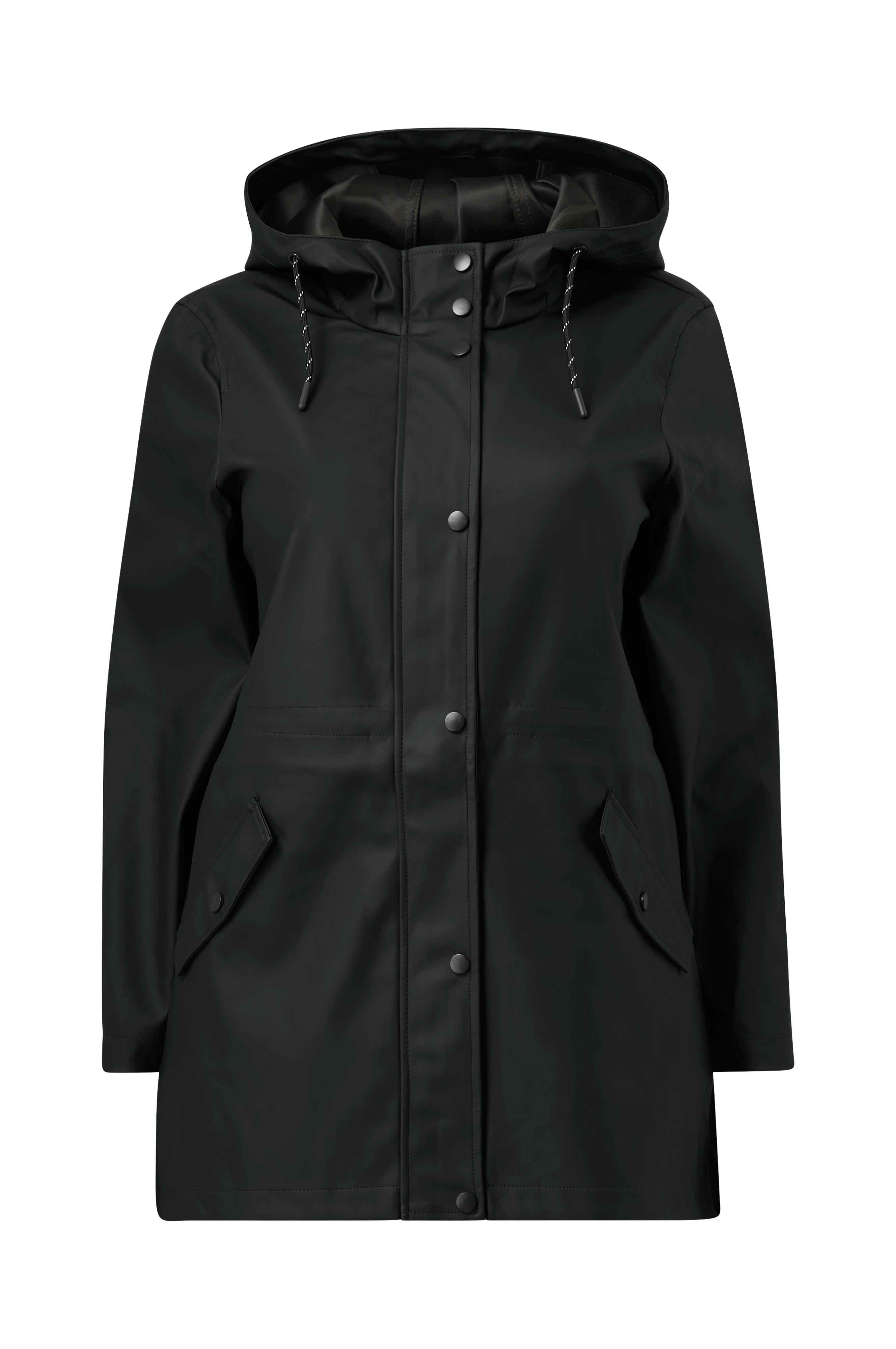 • Plusstorlekar• Vattenavvisande material i PU• Dragkedja med vindslå och tryckknappar fram• Invändig dragsko i midjan• Fast huva med dragsko• Två fickor• Längd: 84 cm i storlek 44