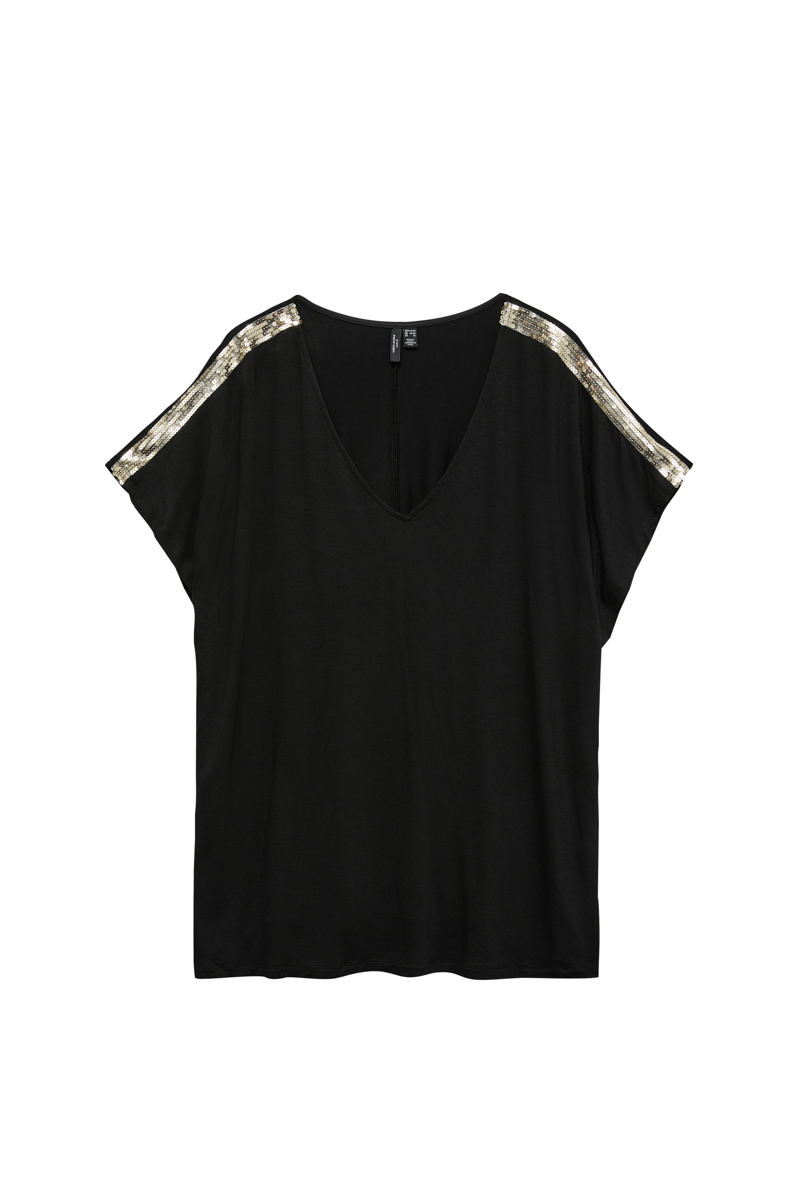 • Mjuk, stretchig topp i viskos• V-ringning• Korta ärmar med dekorativa paljetter• Plusstorlekar