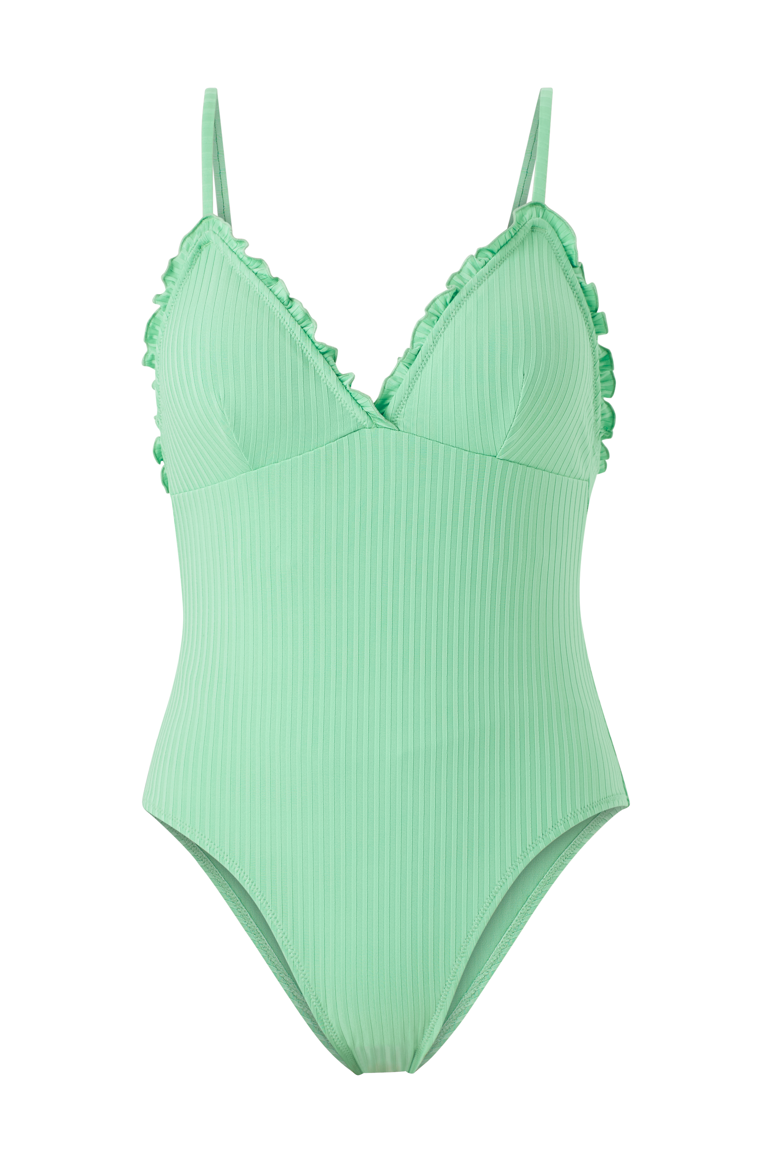 Ribbad baddräkt med uttagbar vaddering och spetskant upptill fram och bak. Smala, justerbara axelband. Fodrad.