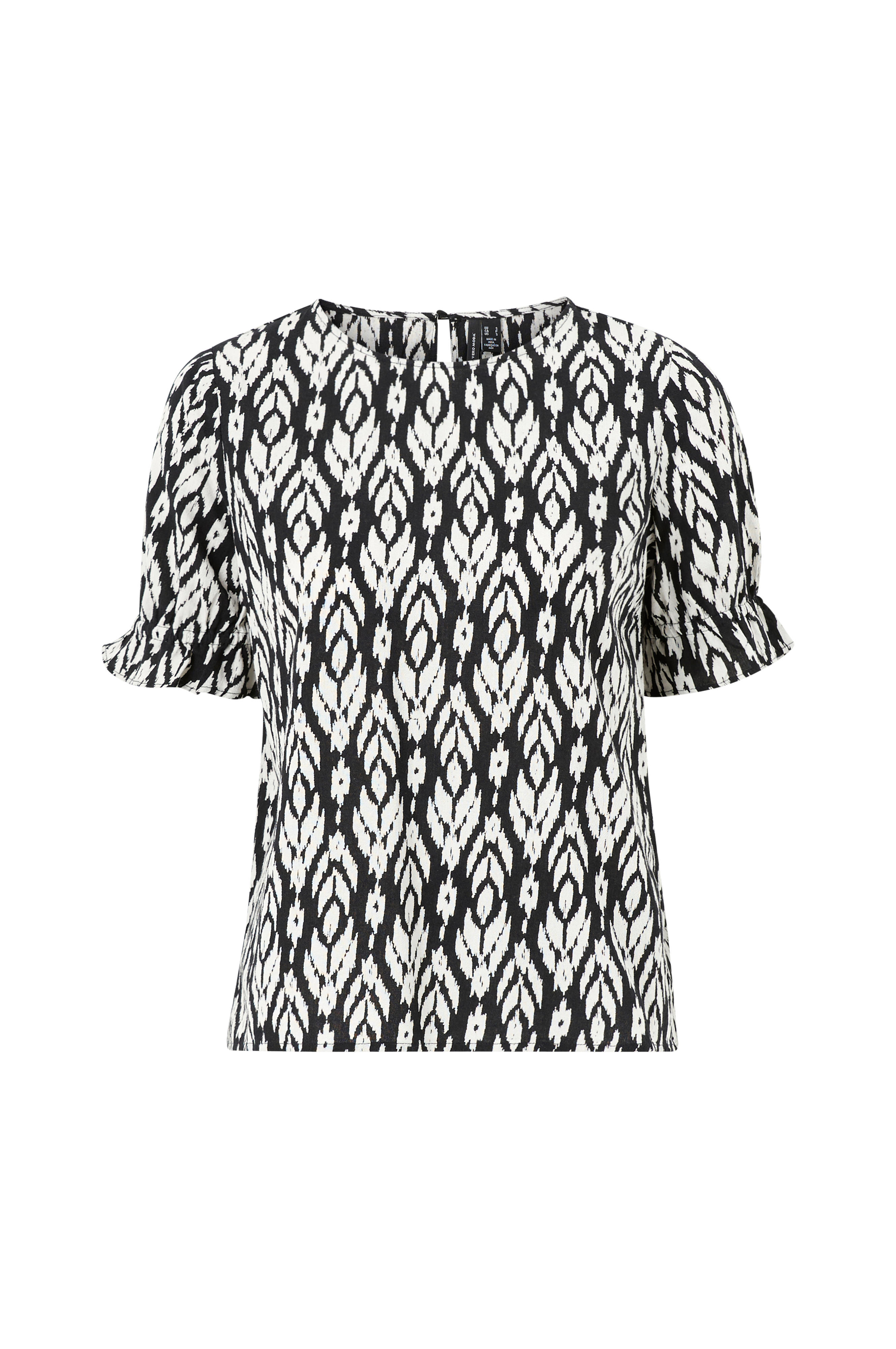 Blus i mönstrad ekobomull. Korta ärmar med resår och volang i ärmsluten och rund hals med sprund och klädd knapp i nacken.