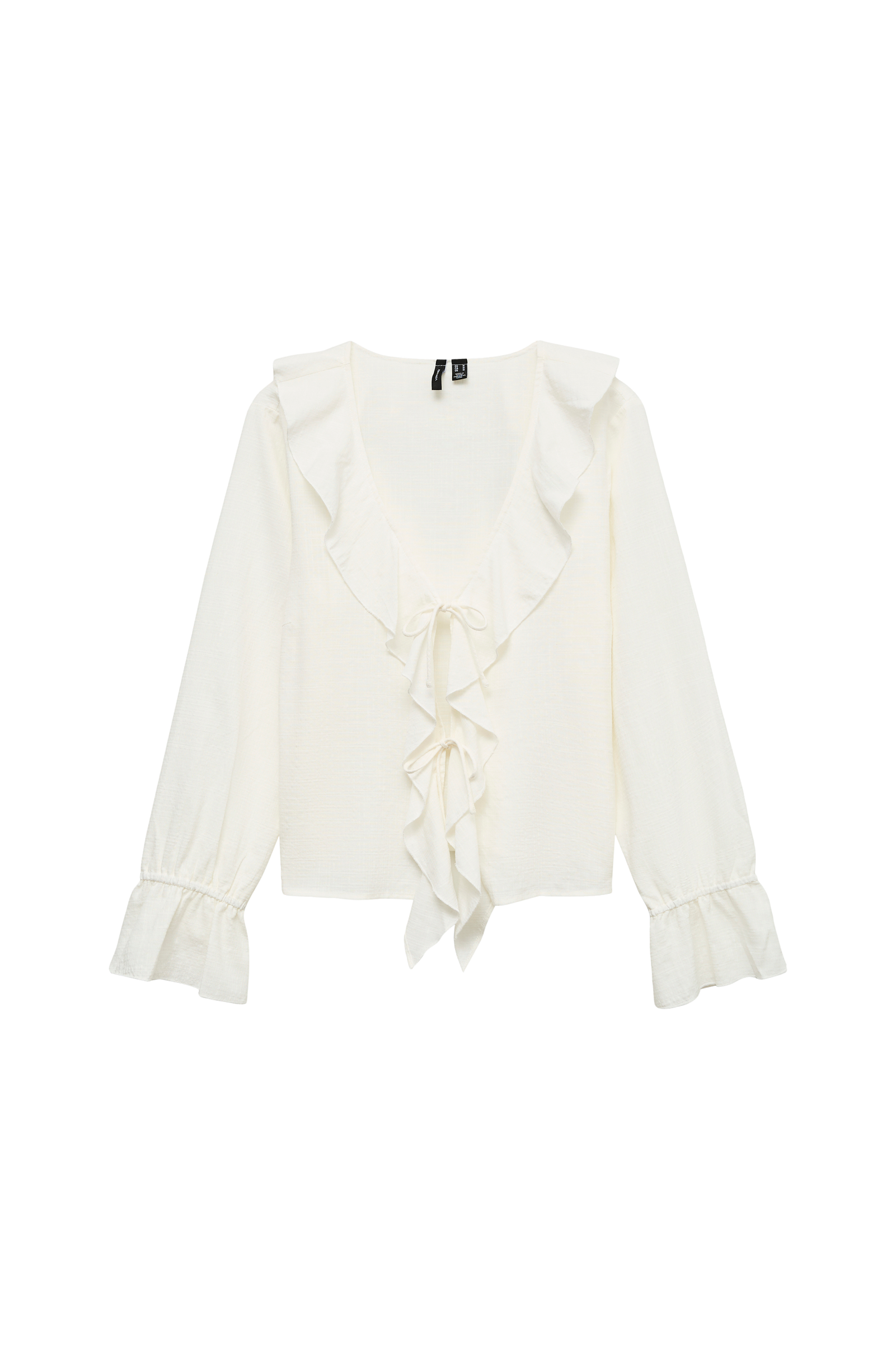 • Strukturvävd blus med knytstängning• V-ringad hals• Volang runt halsen och framtill• Långa ärmar med knytdetalj i ärmsluten