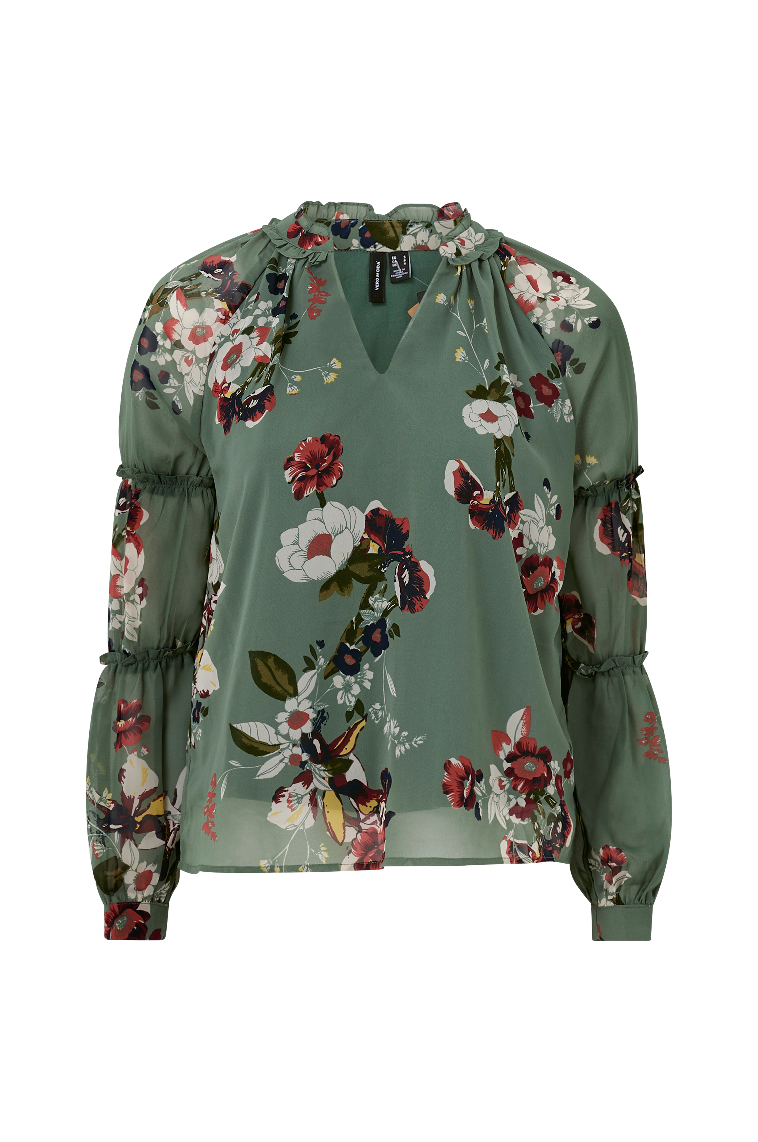 Blus vmLovely L/S V-neck Top från Vero Moda i mönstrad chiffong med trikåfoder. V-ringning med smal volangkant och långa ärmar med rysch och manschett i ärmslut.