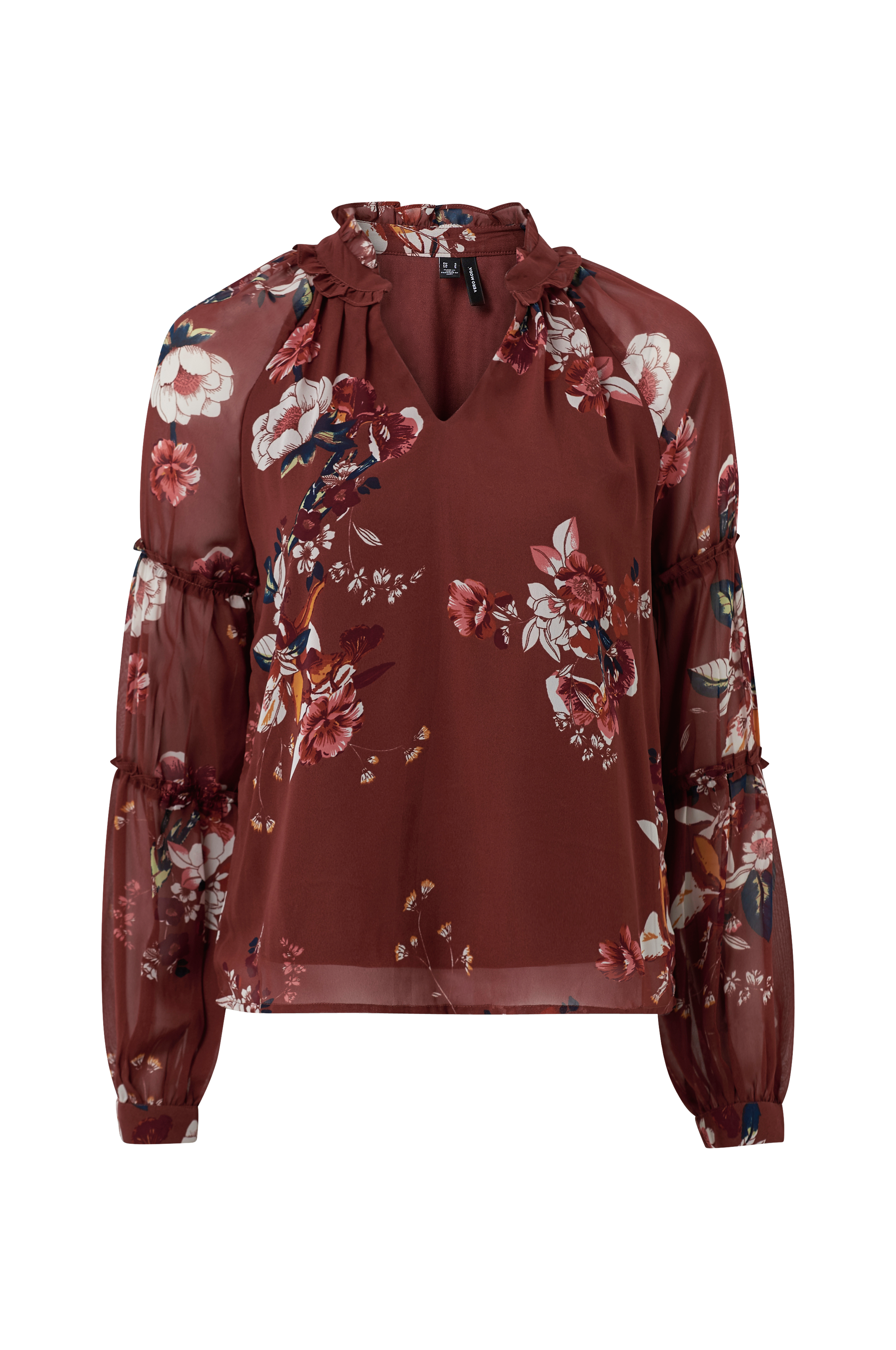 Blus vmLovely L/S V-neck Top från Vero Moda i mönstrad chiffong med trikåfoder. V-ringning med smal volangkant och långa ärmar med rysch och manschett i ärmslut.