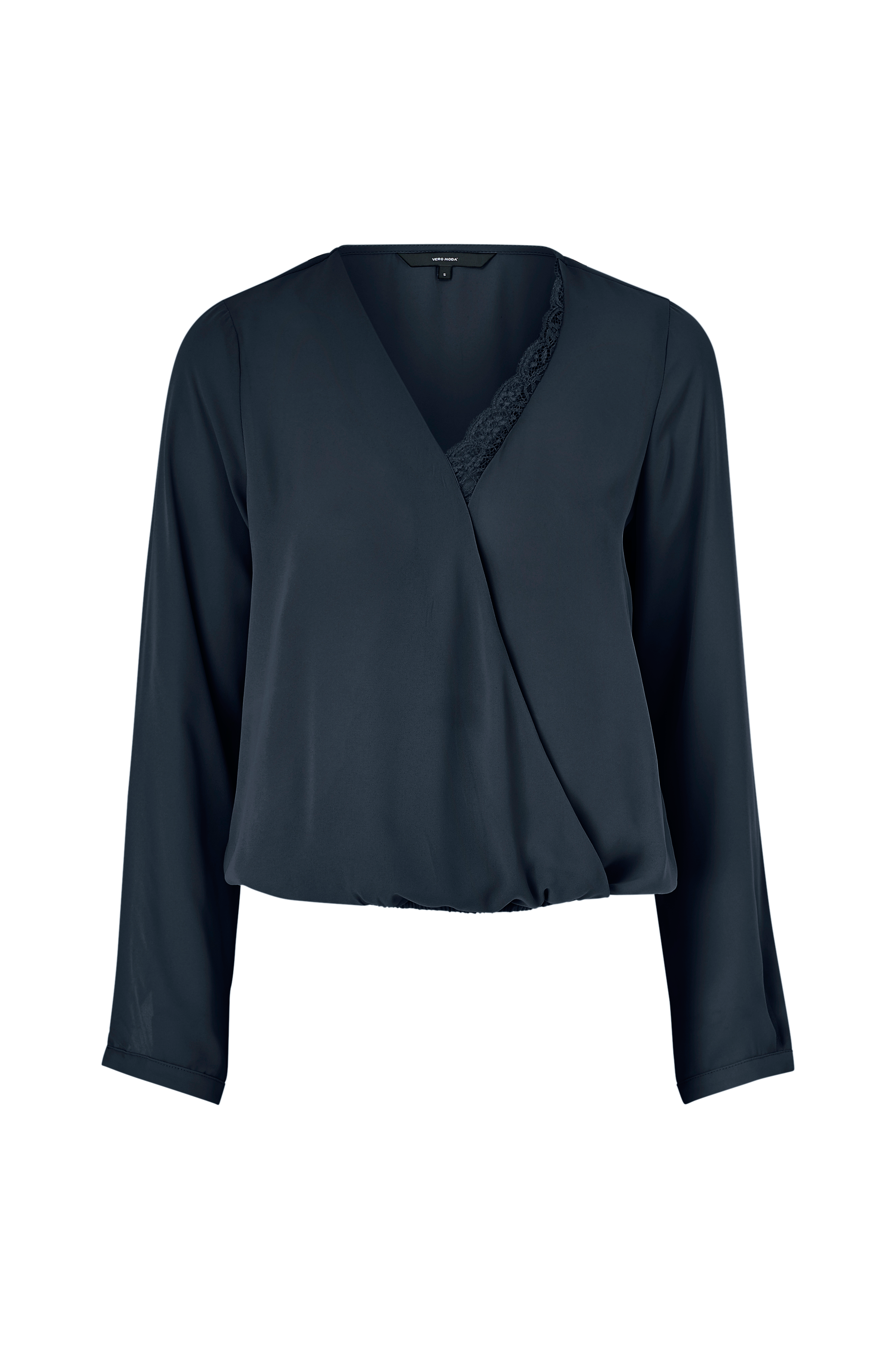 Blus vmScarlet LS Wrap Top från Vero Moda i omlottmodell med fixerad urringning med spets på ena sidan. Elastisk nederkant och lång ärm med smal manschett och knapp. Gjord i vävd kvalitet.