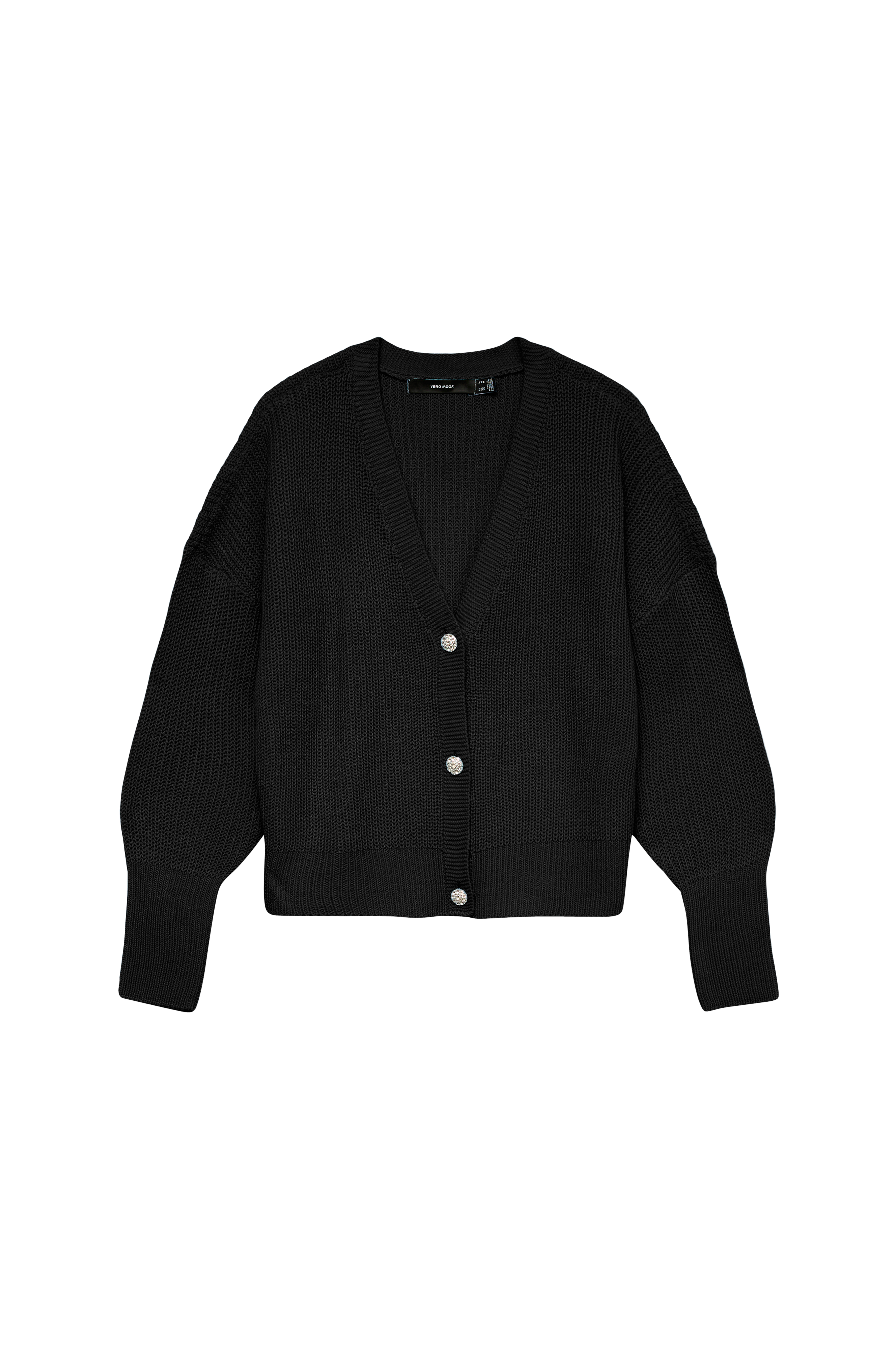 • Stickad cardigan med v-ringad, ribbstickad hals• Knappar med dekorativa strasstenar fram• Långa ärmar med nerhasade axlar och breda ribbmuddar