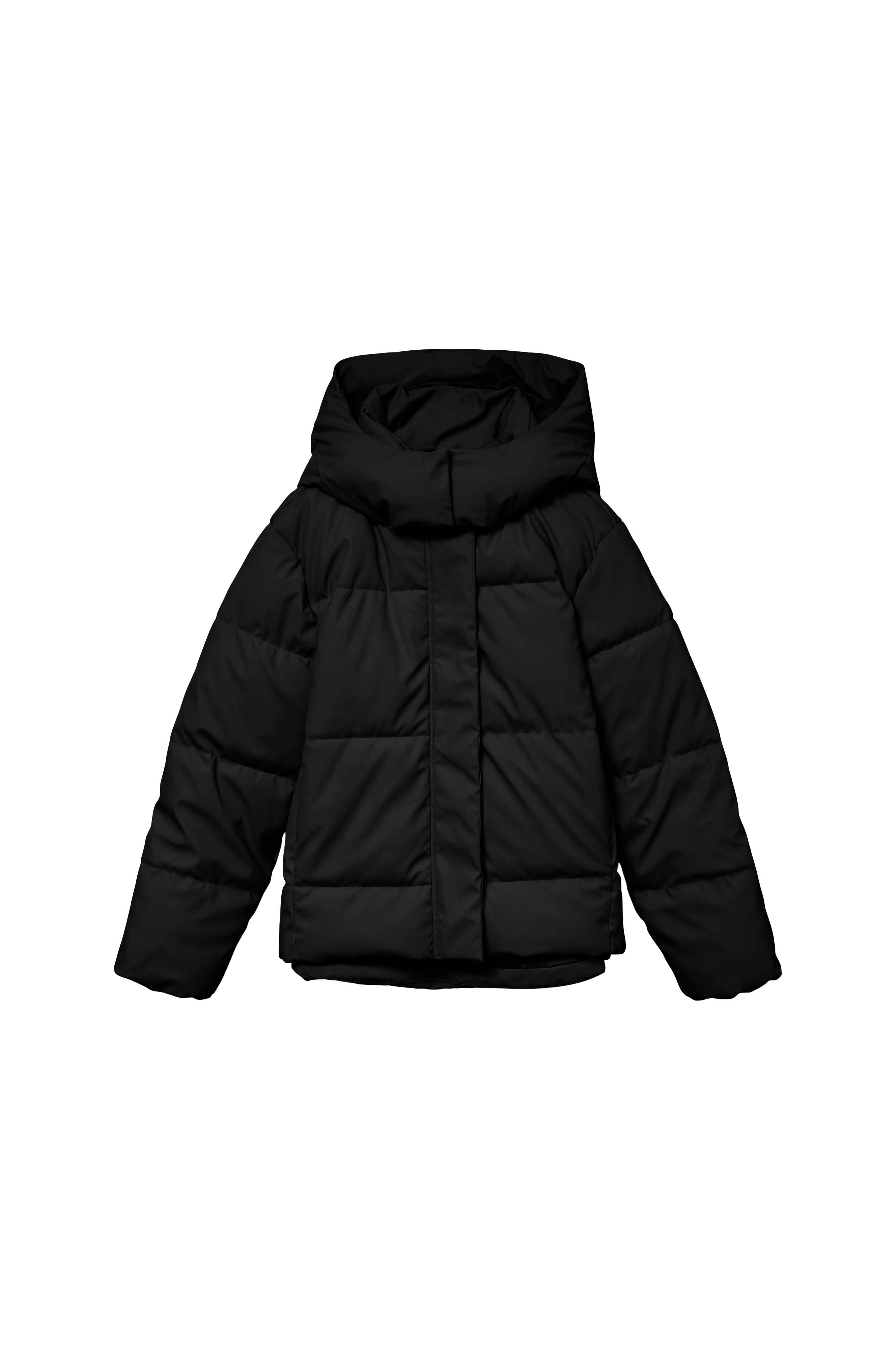 • Vadderad, vattenavvisande jacka med coatad yta • Hög krage med huva • Dragkedjestängning med vindslå och tryckknappar • Dolda dragkedjefickor i sidorna • Något längre baksida med rundad nederkant • Invändig dragsko med stopper i nederkanten • Vävt innerfoder • Längd: 66 cm i storlek S